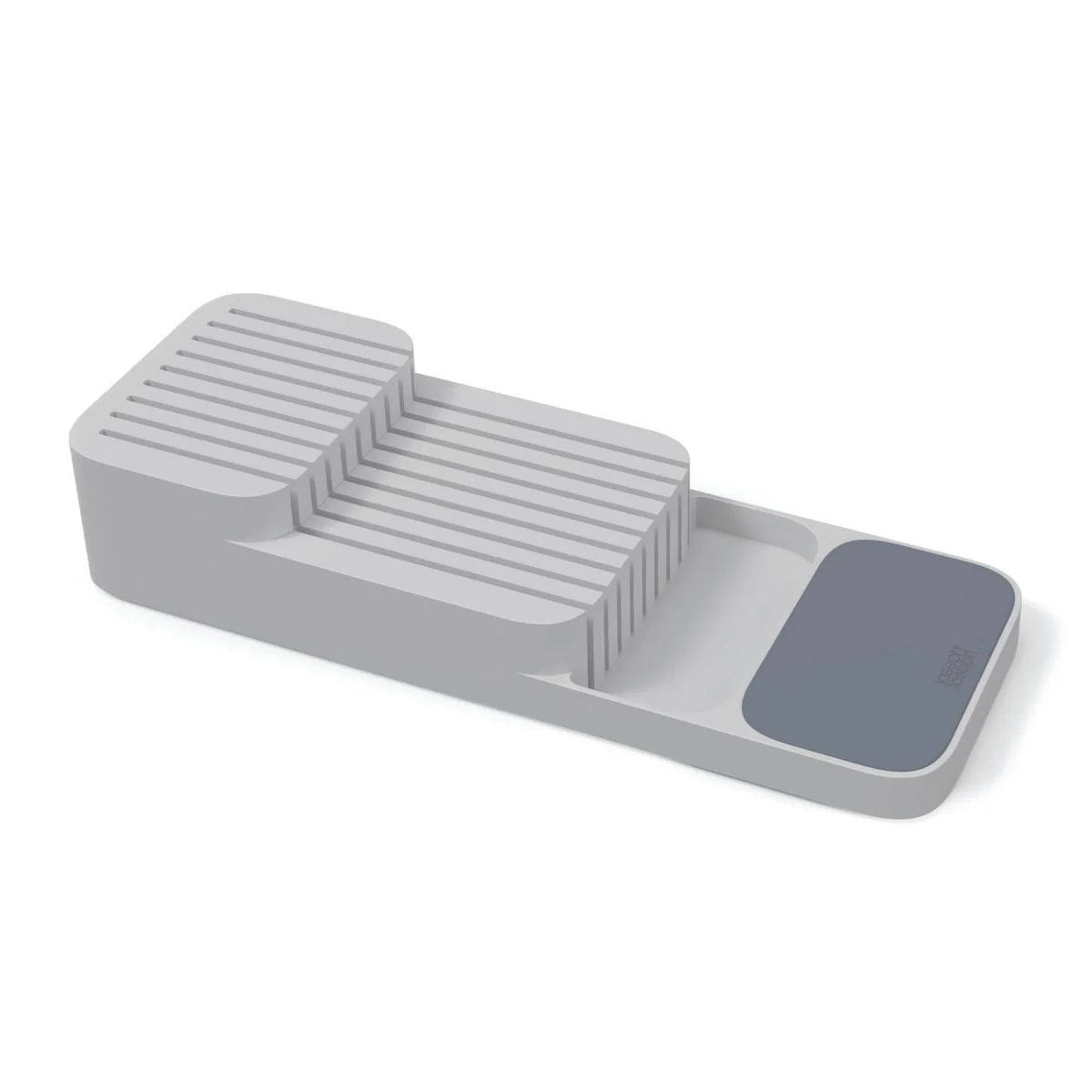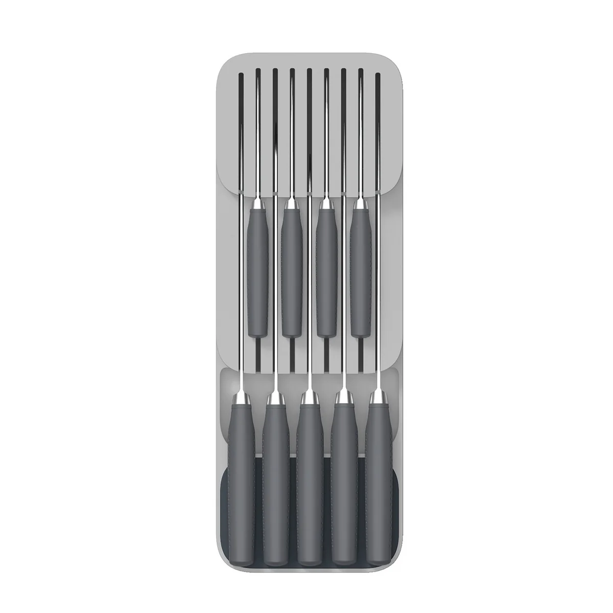 Met de DrawerStore messenbesteller van Joseph Joseph kunnen scherpe messen eenvoudig worden opgeborgen in de keukenlade. Dit type van messenopslag biedt verschillende voordelen: Enerzijds beschermt het organisatiesysteem de messen, die nu niet meer ongestructureerd en los in de lade liggen, en anderzijds dient het als een ruimtebesparende oplossing die tot negen messen in een zeer kleine ruimte kan opvangen.