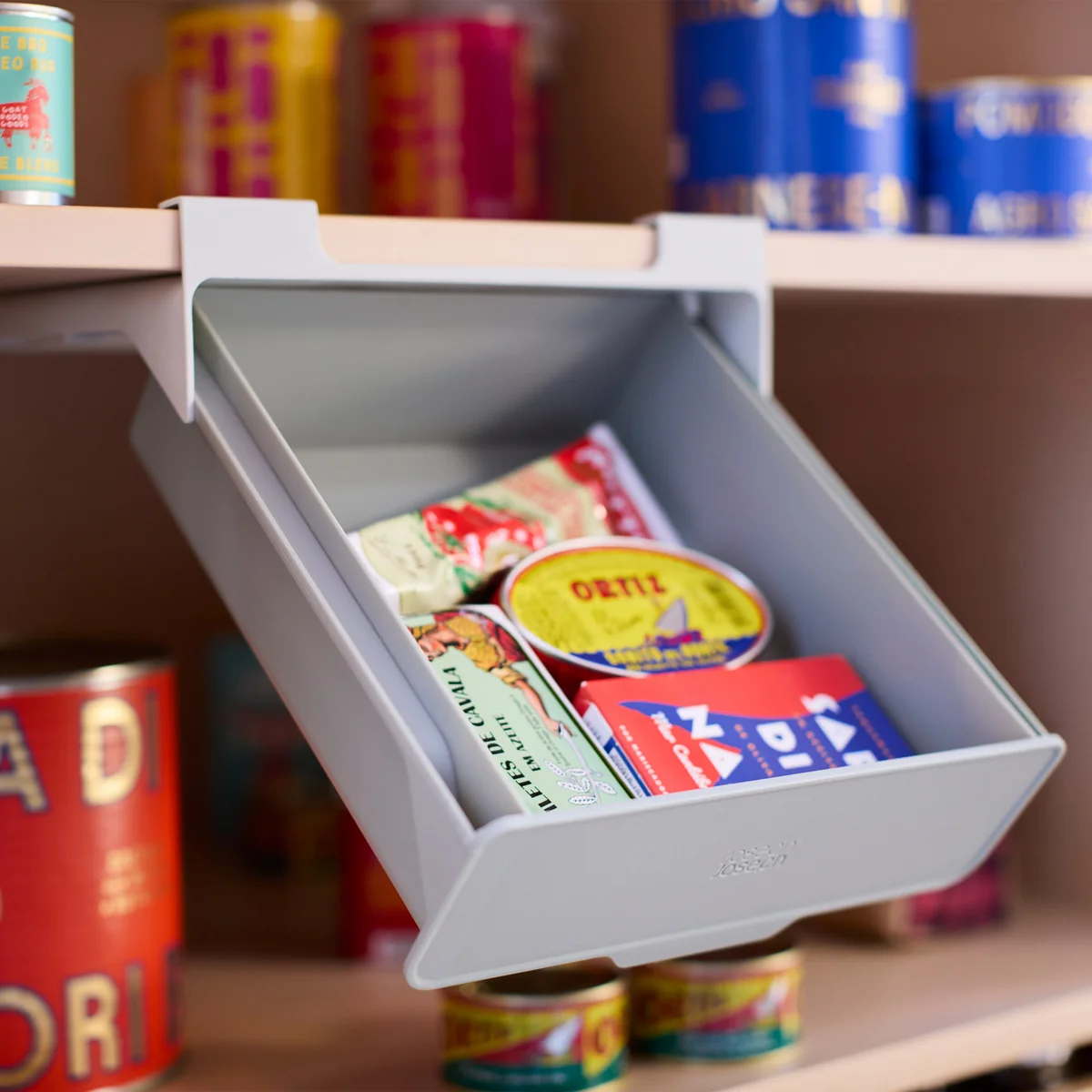 Om de ruimte onder de planken te benutten, bevat het assortiment ook een kruidenrekje en een lade. CupboardStore kruidenrek en een lade. De bevestigingen worden zonder gereedschap bevestigd met sterk, niet-markerend 3M VHB plakband en zijn geschikt voor keukenkastjes vanaf een breedte van 40 cm. Het kruidenrek biedt plaats aan 7 standaard kruidenpotjes en de lade is perfect voor het opbergen van kleine spullen, pakjes of zakjes.