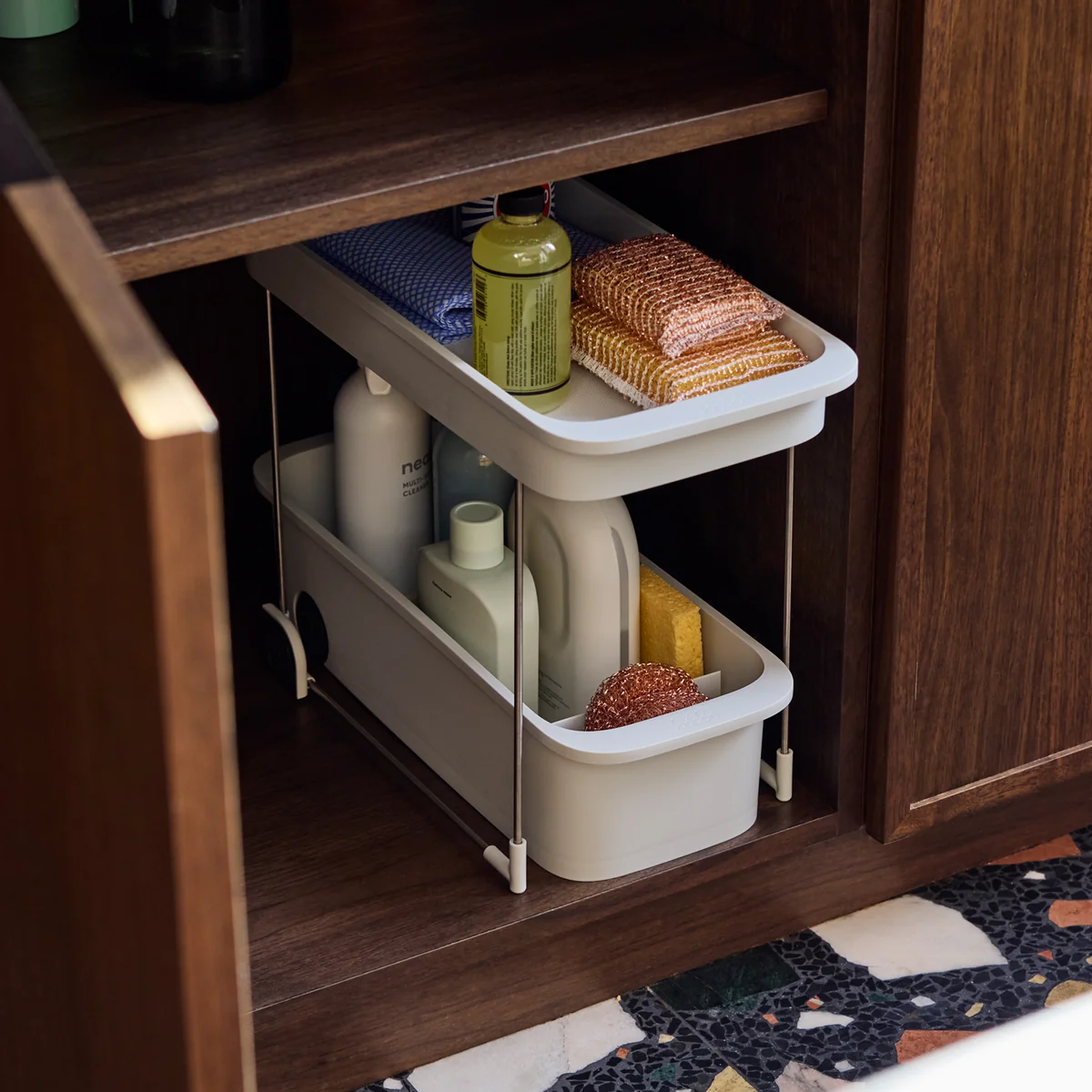 Deze caddy vereenvoudigt het opbergen van schoonmaakproducten enorm. Hij heeft grote, open compartimenten die ideaal zijn voor het opbergen van een grote verscheidenheid aan flessen schoonmaakmiddel en sprays, en een compact voorvak voor sponzen en doeken. Dankzij de lichtlopende wielen in de basis en een grote rand aan de voorkant kan de caddy gemakkelijk naar voren worden getrokken, zodat je ongehinderd bij de inhoud kunt.