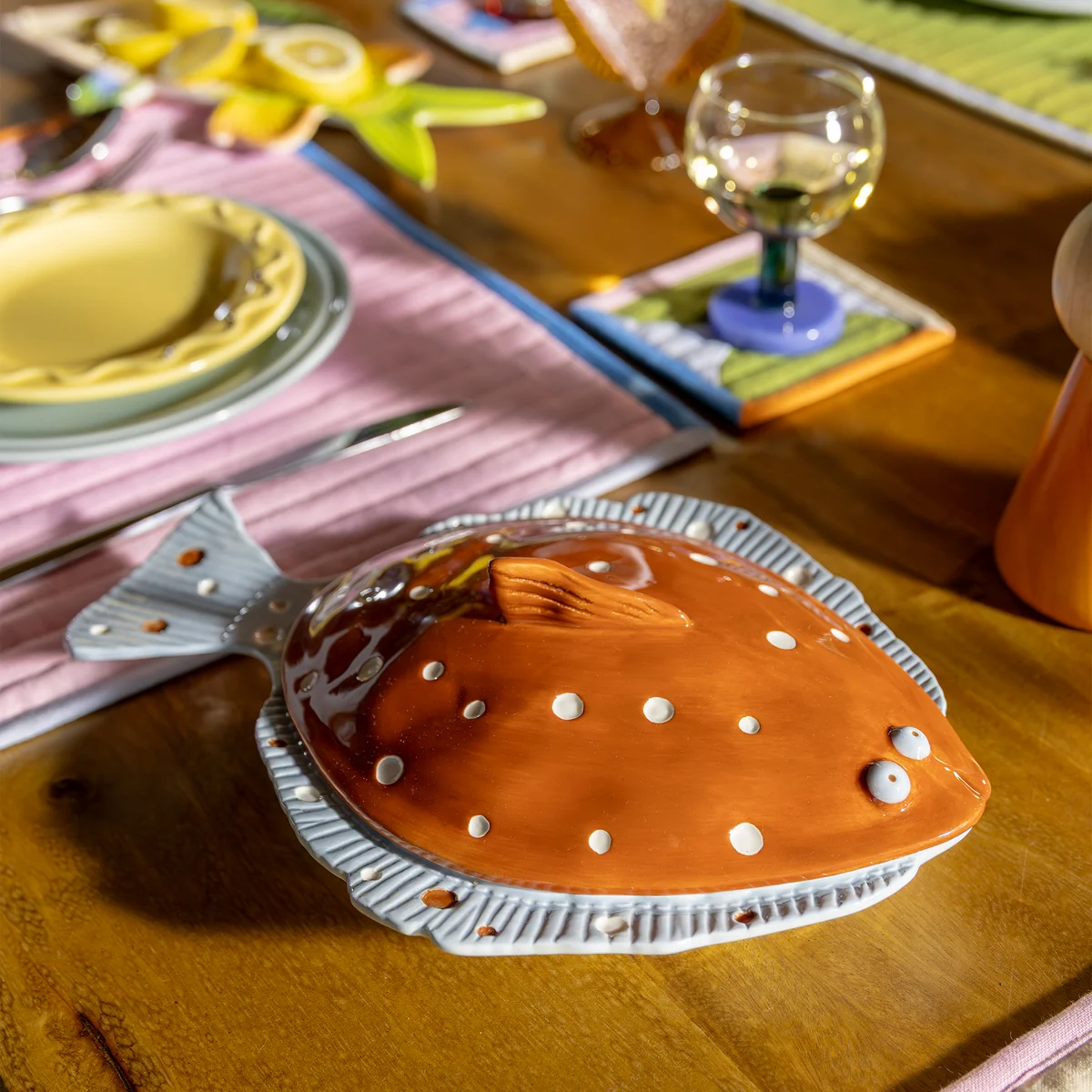 Het levendige kleurenschema en de opvallende steekafbeelding geven de tafel een speels karakter en onderstrepen een creatieve inrichtingsstijl zonder de alledaagse praktische vereisten uit het oog te verliezen.