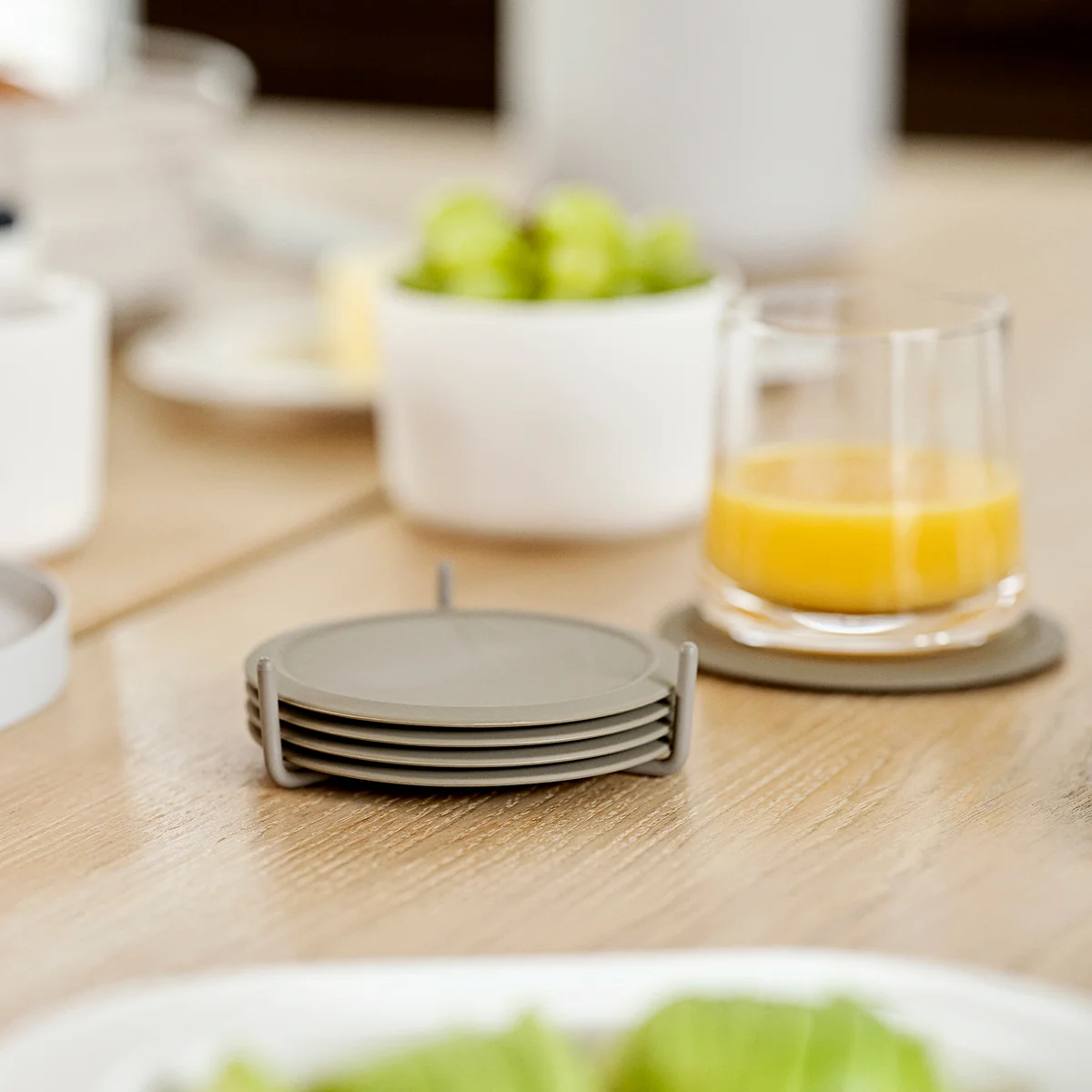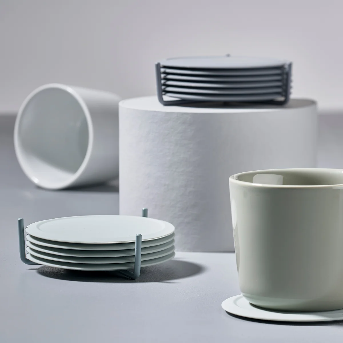 Dankzij de bijbehorende voet van metaal kunnen de door VE2 ontworpen glazen onderzetters na gebruik ruimtebesparend worden verzameld en opgeborgen. De glazen onderzetters zijn verkrijgbaar in verschillende kleuren, die ook onderling gecombineerd kunnen worden en prachtig bij de Peili serie van Zone Denmark passen.