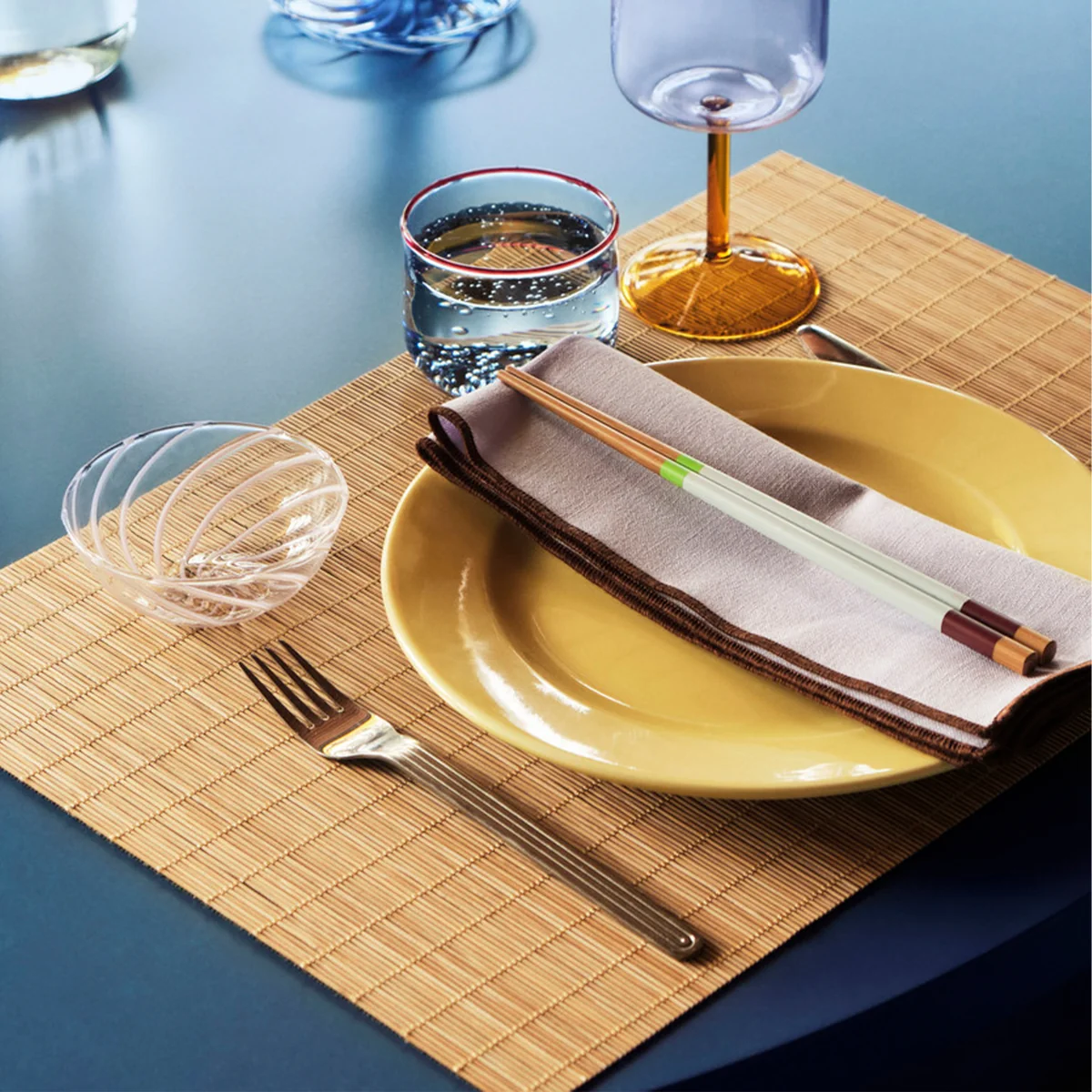 De tweedelige tafelset van HAY bestaat uit bamboe en polyester. De naden vormen parallelle lijnen op het oppervlak, die niet alleen voor een bijzondere stabiliteit zorgen, maar ook een esthetisch patroon vormen. Door hun natuurlijke schaduw kunnen ze op tafels met verschillende texturen worden geplaatst zonder het zicht te verstoren. De placemat kan aan beide zijden worden gebruikt en kan, als hij vuil is, moeiteloos met een vochtige doek worden gereinigd. De placemat is praktisch voor dagelijks gebruik en beschermt de tafel tegen eenvoudig vuil of kleine hoeveelheden vloeistof. De natuurlijke houtlook is ook een lust voor het oog in de tuin.