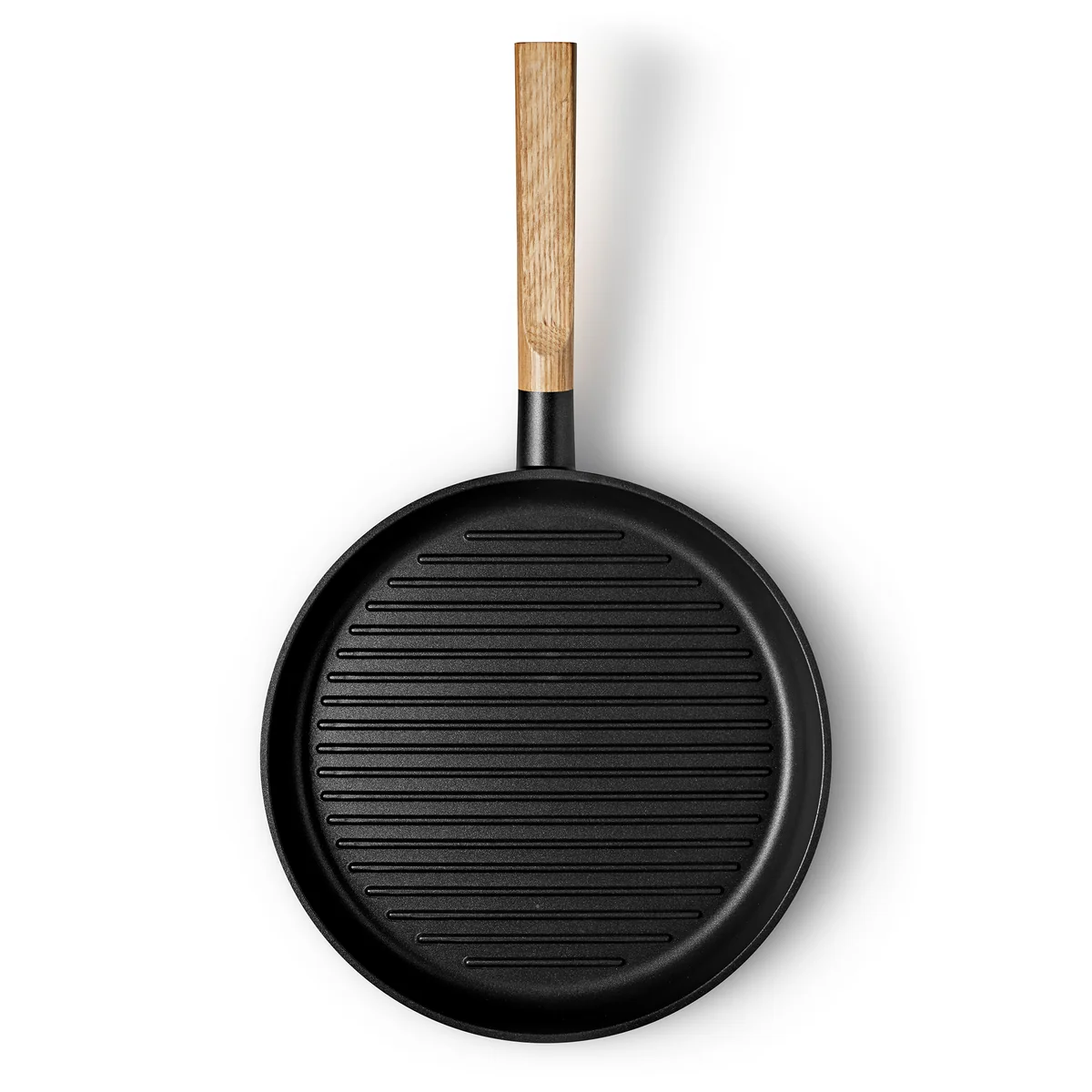 De Nordic Kitchen Grill Pan van Eva Solo maakt deel uit van de gelijknamige serie, met een rustieke uitstraling en optimale warmteverdeling. Met de typische groeven is de pan ideaal voor het grillen van biefstuk en ander vlees. Maar natuurlijk kunnen ook groenten zoals aubergines, courgettes en andere lekkernijen in de grillpan worden bereid. De pan is gemaakt van aluminium en voorzien van een antiaanbaklaag, waardoor hij niet alleen aangenaam licht is, maar ook gemakkelijk te reinigen.