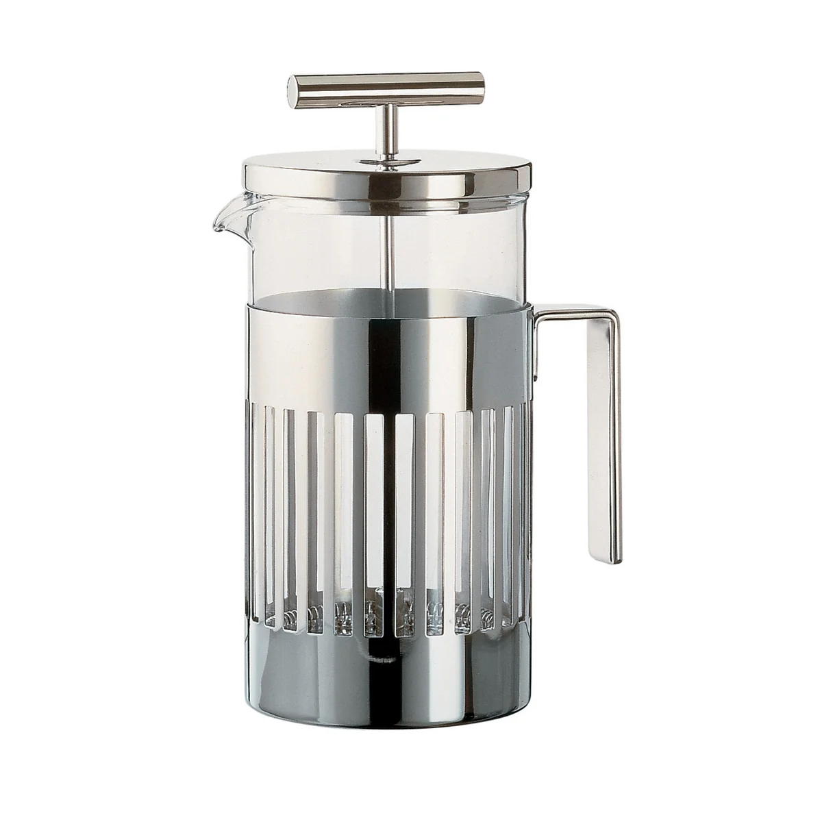 De "9094" filterpers met hittebestendig glas werd ontworpen door de beroemde architect en ontwerper Aldo Rossi in 1986. Alessi produceerde de eenvoudige, elegante cafetiere in twee verschillende maten - voor drie of acht kopjes.