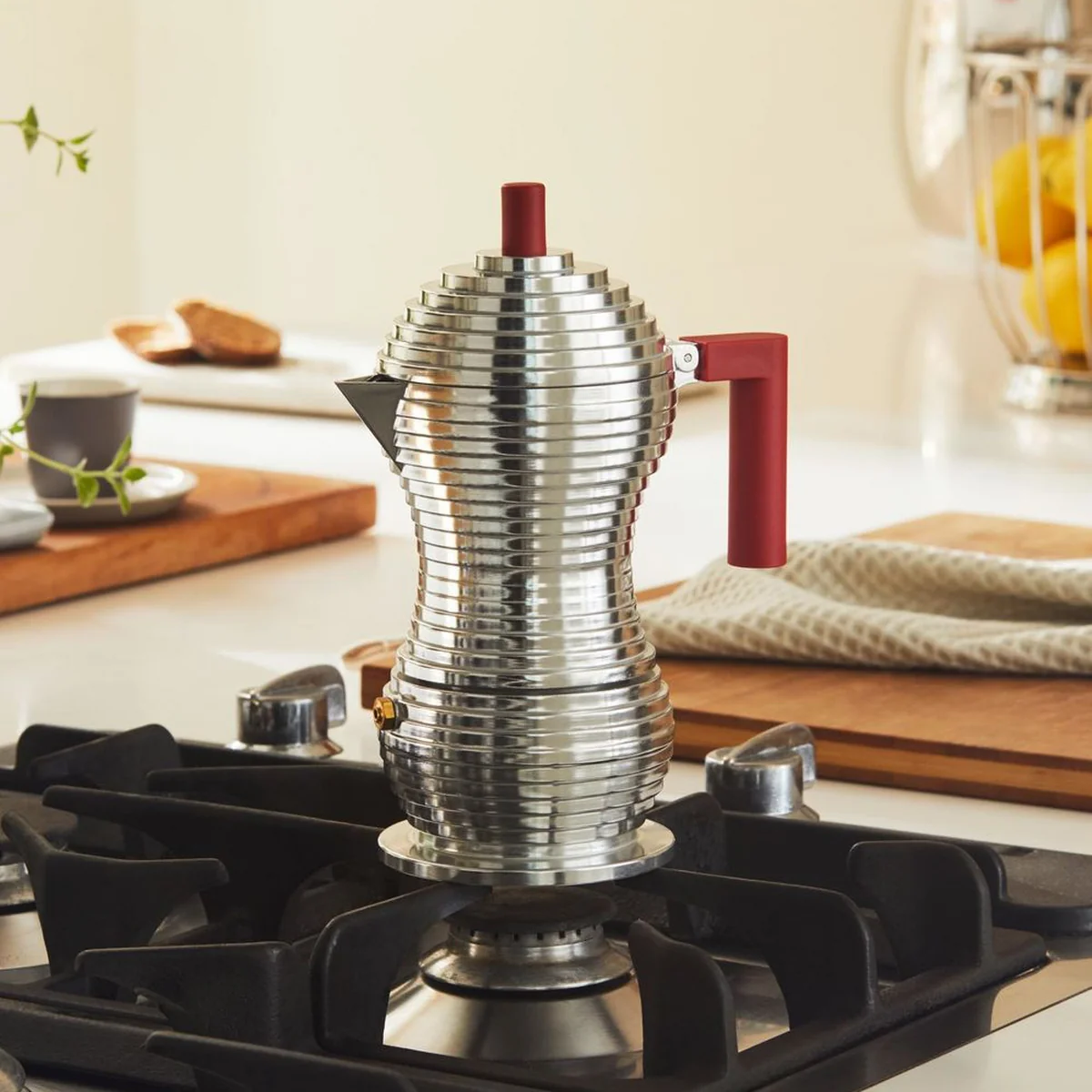 De Pulcina espressomachine van Michele De Lucchi voor Alessi is gemaakt van gegoten aluminium en is verkrijgbaar in verschillende maten en kleuren.