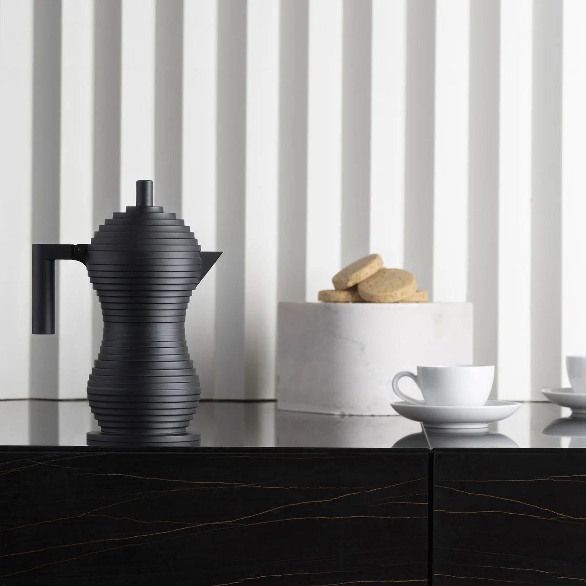 Pulcina van Alessi is het geesteskind van architect Michele De Lucchi en een espressopot voor echte koffieliefhebbers. Het revolutionaire ontwerp combineert technologie ontwikkeld door illycaffè op basis van onderzoek naar de dynamiek van warmtestroming met de projectervaring van Alessi .