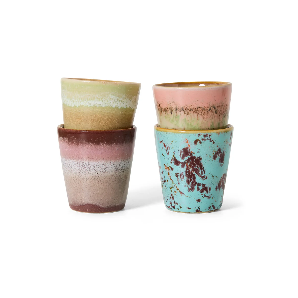 Zowel voor oude verzamelaars als voor nieuwe ontdekkers een reden om zich te verheugen: de 70's espressokopjes & mokken van HKliving van steengoed zijn net zo uniek als iemands vingerafdruk, omdat ze met de hand worden gemaakt en geglazuurd. Zo ontstaan de prachtige patronen en kleuren die elke eettafel en servieskast individueel verfraaien. Bovendien beschermt het dikwandige porselein tegen hete handen.