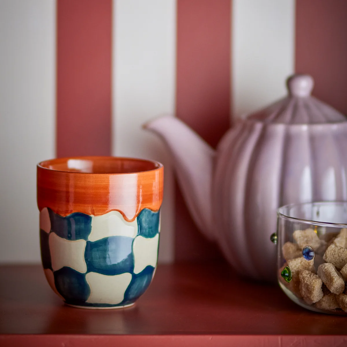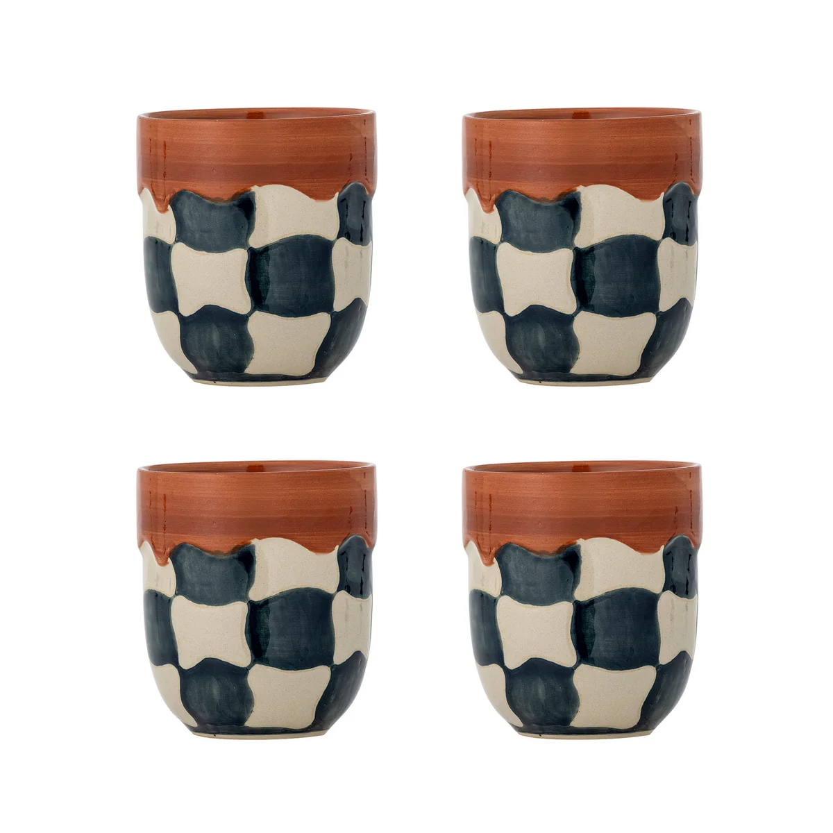 De Check mokken van Bloomingville combineren Scandinavisch design met handgemaakte charme. De set van 4 is gemaakt van hoogwaardig steengoed en heeft een grafisch geruit patroon in blauwe en natuurlijke tinten. Elke mok is met de hand beschilderd, waardoor kleine variaties ontstaan die elke mok echt uniek maken. De warme, roodkleurige rand aan de bovenkant voegt een stijlvol accent toe en geeft de set een speciale warmte.