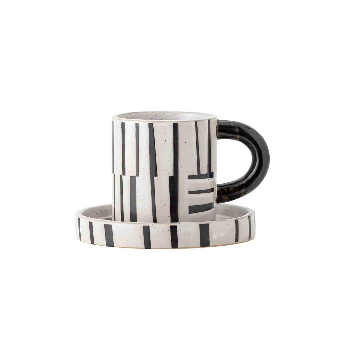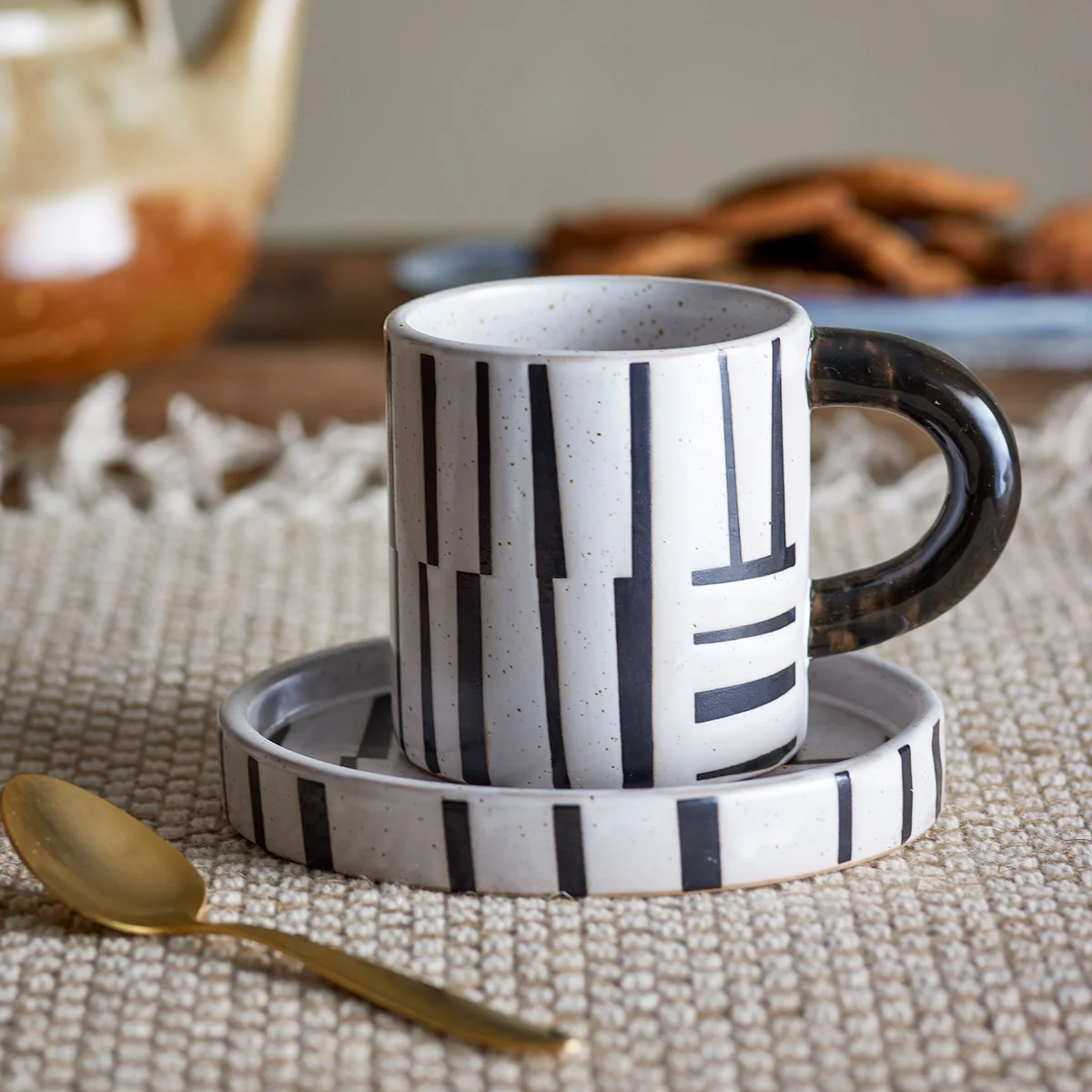 De Frankie kop en schotel maakt indruk met zijn moderne, grafische ontwerp en elegante zwarte kleurstelling. De set is gemaakt van hoogwaardig steengoed en is geschikt voor zowel gedeeld als afzonderlijk gebruik - perfect om te genieten van een warm drankje met een klein hapje op de schotel. Een stijlvolle set die een modern en individueel tintje geeft aan elke tafelschikking.