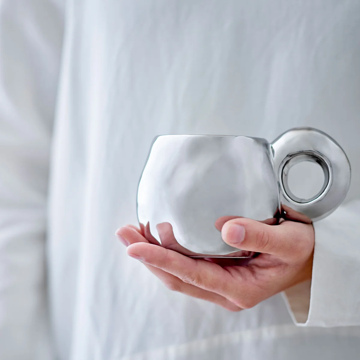 De Shine-mok maakt indruk met zijn gegalvaniseerde oppervlak, waardoor hij een elegante chromen afwerking krijgt. Het grote, ronde handvat maakt hem niet alleen makkelijk hanteerbaar, maar zorgt ook voor een decoratief designaccent. Op de mokkenplank of bij de koffie - deze mok brengt moderne glamour in elke keuken.