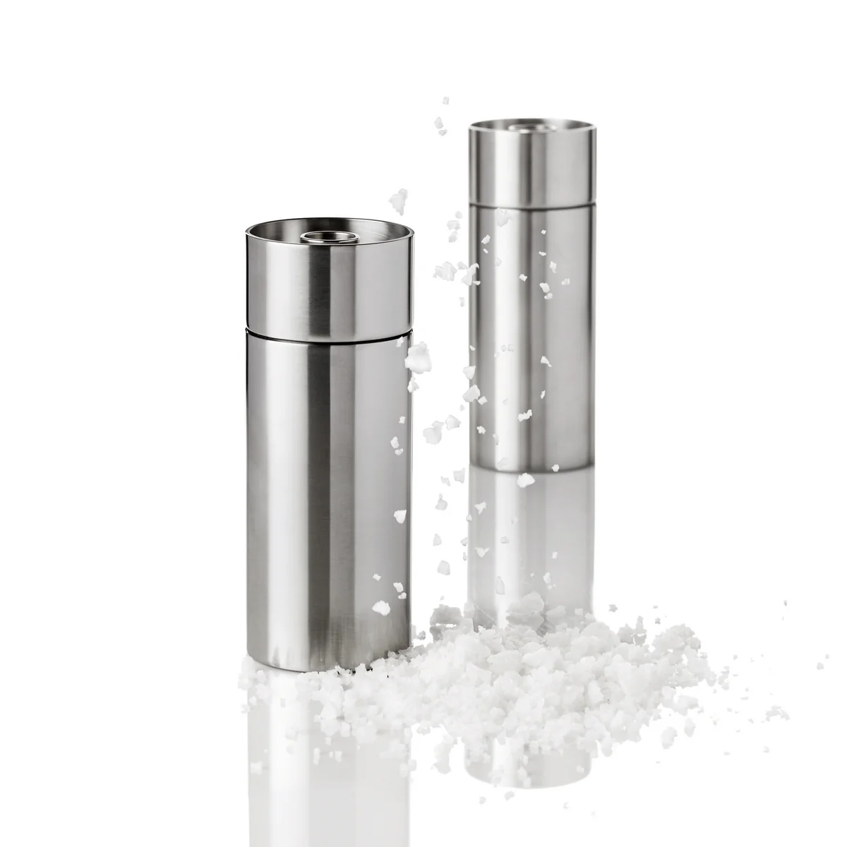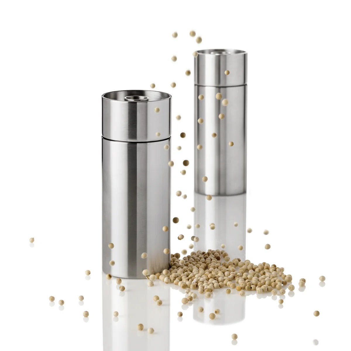 De peper- en zoutmolens maken deel uit van de Cylinda-lijn van Stelton en zijn ontworpen door Arne Jacobsen. Het eenvoudige, functionele ontwerp van de molen maakt het tot een tijdloos designobject dat zowel in de jaren 60 als nu perfect op tafel past.