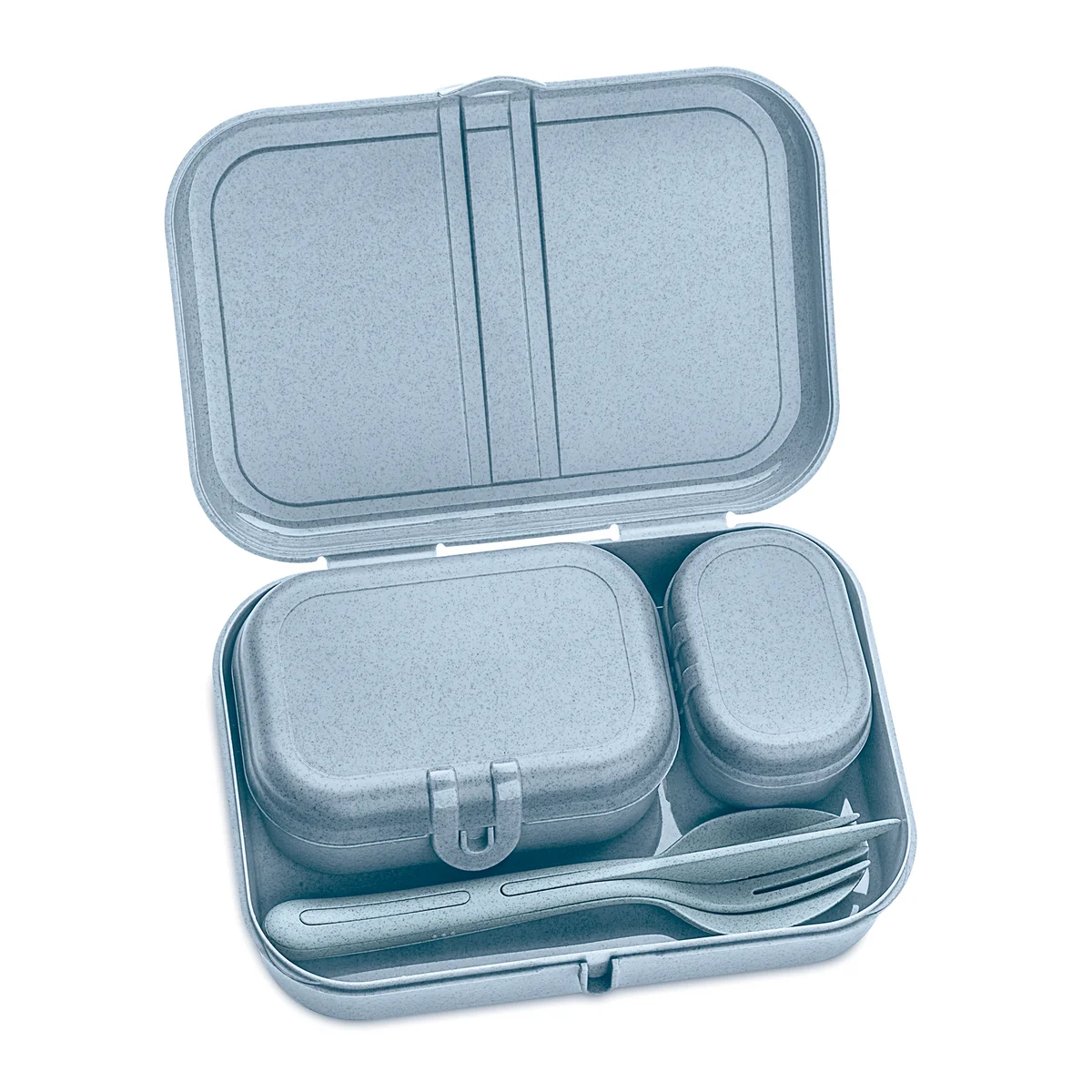 De Pascal Ready lunch box set met Klikk bestek ( Organic ) van Koziol is ideaal voor het ontbijt op kantoor en een kleine snack tussendoor. Een praktische metgezel voor school, kantoor of een trektocht, de set bestaat uit twee S-formaat lunchboxen die naast elkaar in de grote box passen. Op die manier kunt u verschillende voedingsmiddelen van elkaar scheiden en ze toch praktisch in één doos stoppen. Met de Klikk bestek, kunt u overal van het eten genieten.