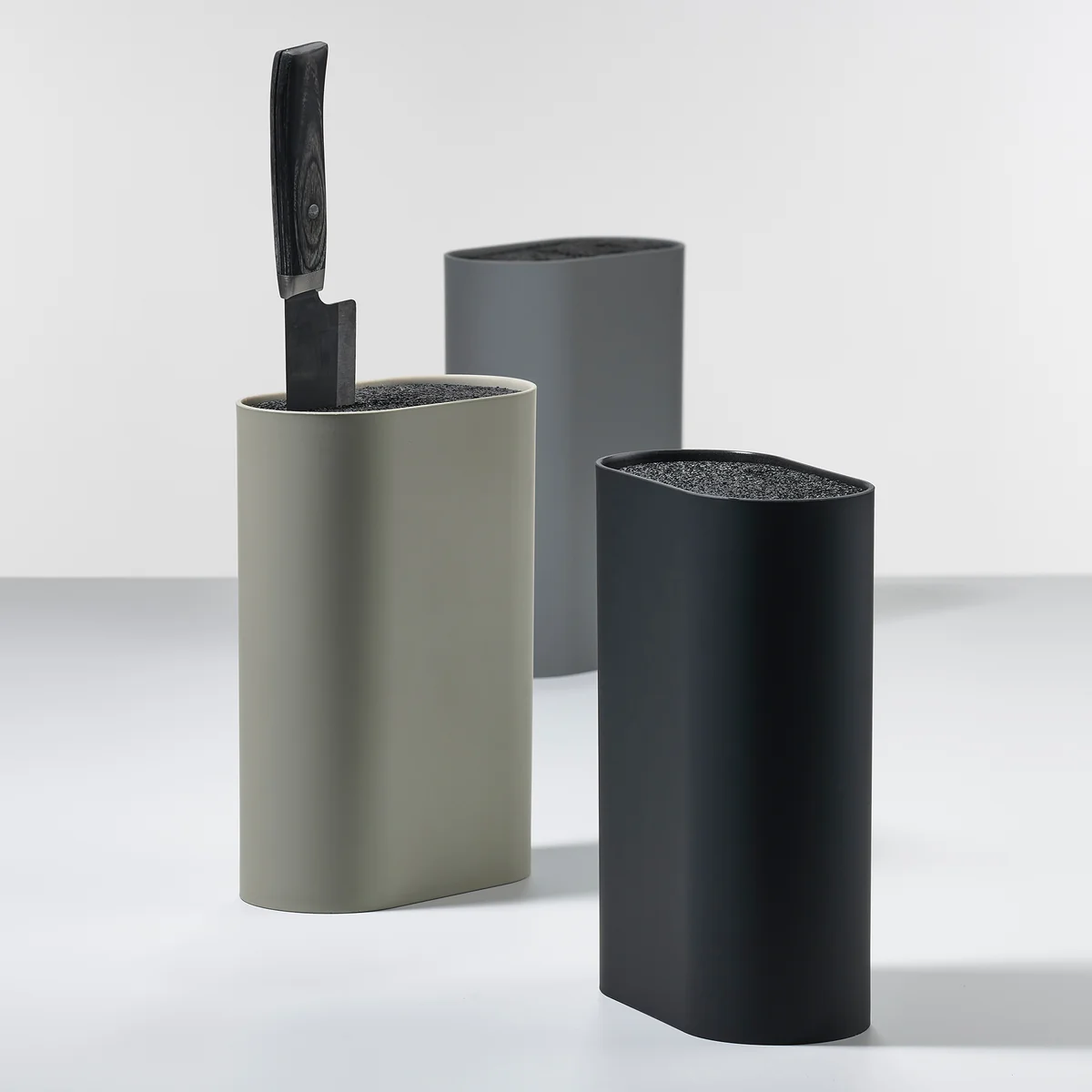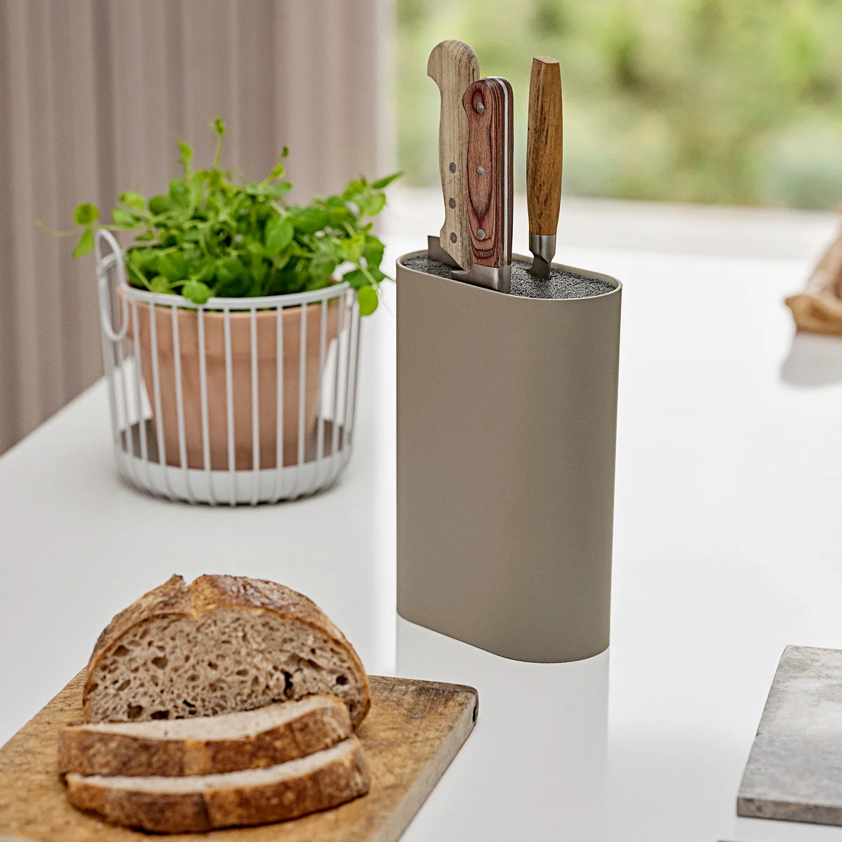 Het Singles messenblok van Zone Denmark is een veilige en opgeruimde manier om messen bij de hand te houden op tafel of op het werkblad. De hoge, cilindervormige bak is gevuld met fijne, dicht op elkaar geplaatste kunststof staafjes die alle messen - groot of klein - stabiel op hun plaats houden. Zo zijn de messen niet alleen veilig verborgen, maar ook zelf beschermd tegen invloeden van buitenaf.