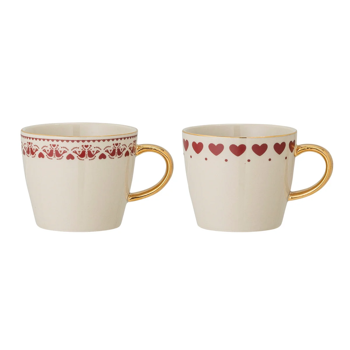 De Jolly mokken met handvat van Bloomingville zijn een feestelijke en vrolijke aanwinst voor de keuken. De 2 kopjes zijn gemaakt van steengoed en hebben een rood-wit motief op het ene en diverse kerstmotieven op het andere.