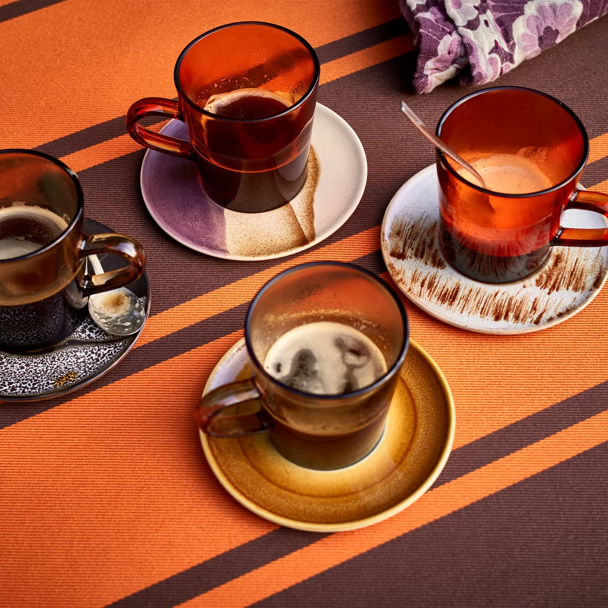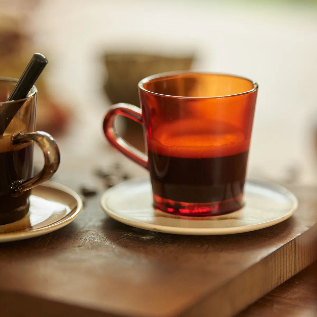 De 70's HKliving glazen koffiemokken van het Nederlandse bedrijf maken indruk met hun klassieke silhouet in een moderne, frisse uitvoering. Het extreem aantrekkelijke gekleurde glas is hittebestendig en daarom ideaal voor alle soorten warme dranken. De 70's koffiebekers zijn verkrijgbaar in een set van 4 en kunnen prachtig gecombineerd worden met andere serviesartikelen uit de gehele 70's HKliving collectie van .