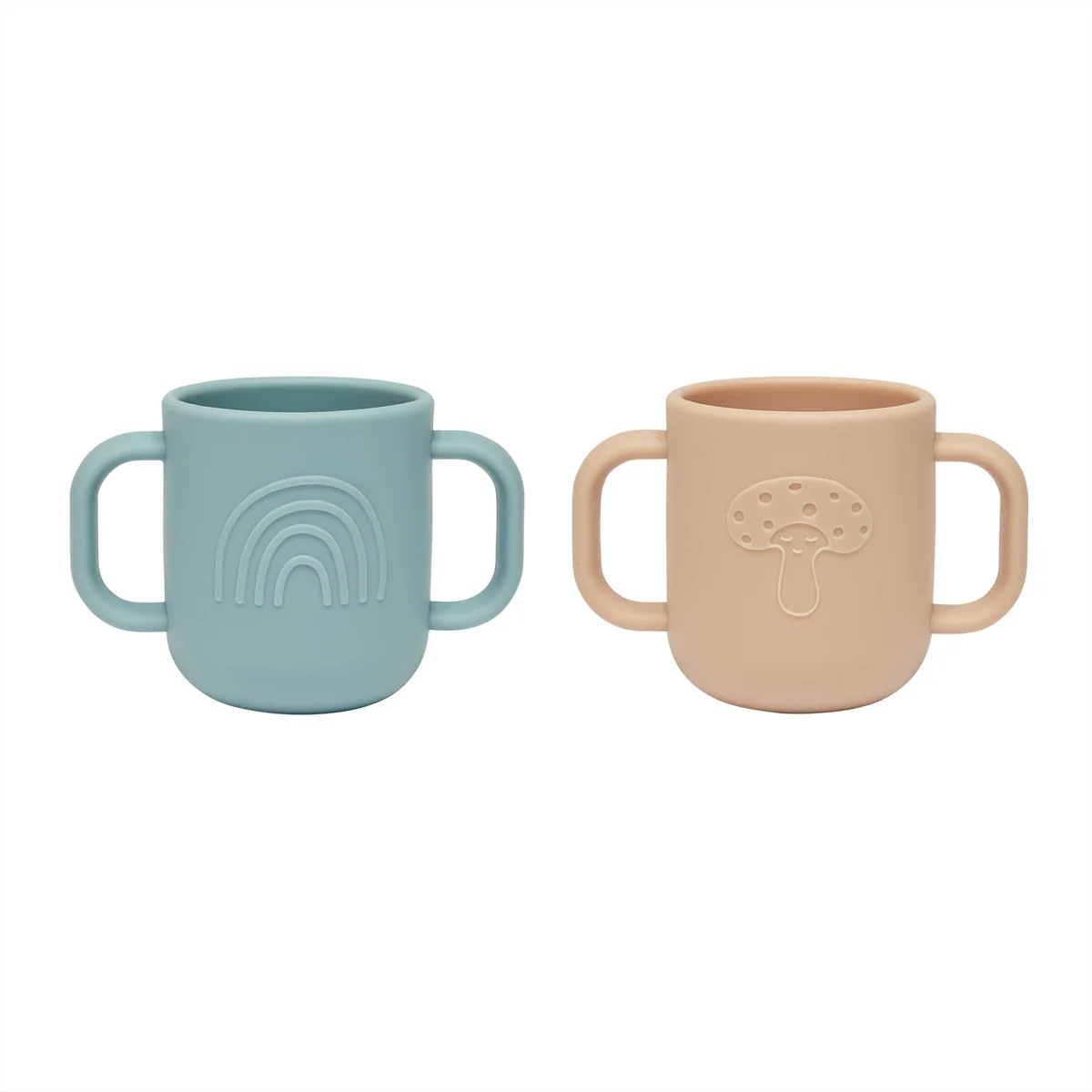 De Kappu OYOY OYOY kinderbekers met handvatten van Mini zijn volledig gemaakt van siliconen en versierd met bekende figuren zoals paddenstoelen en regenbogen. De bekers zijn ontworpen in pastelkleuren en hebben twee handvatten zodat het kind gemakkelijker zelfstandig kan drinken.