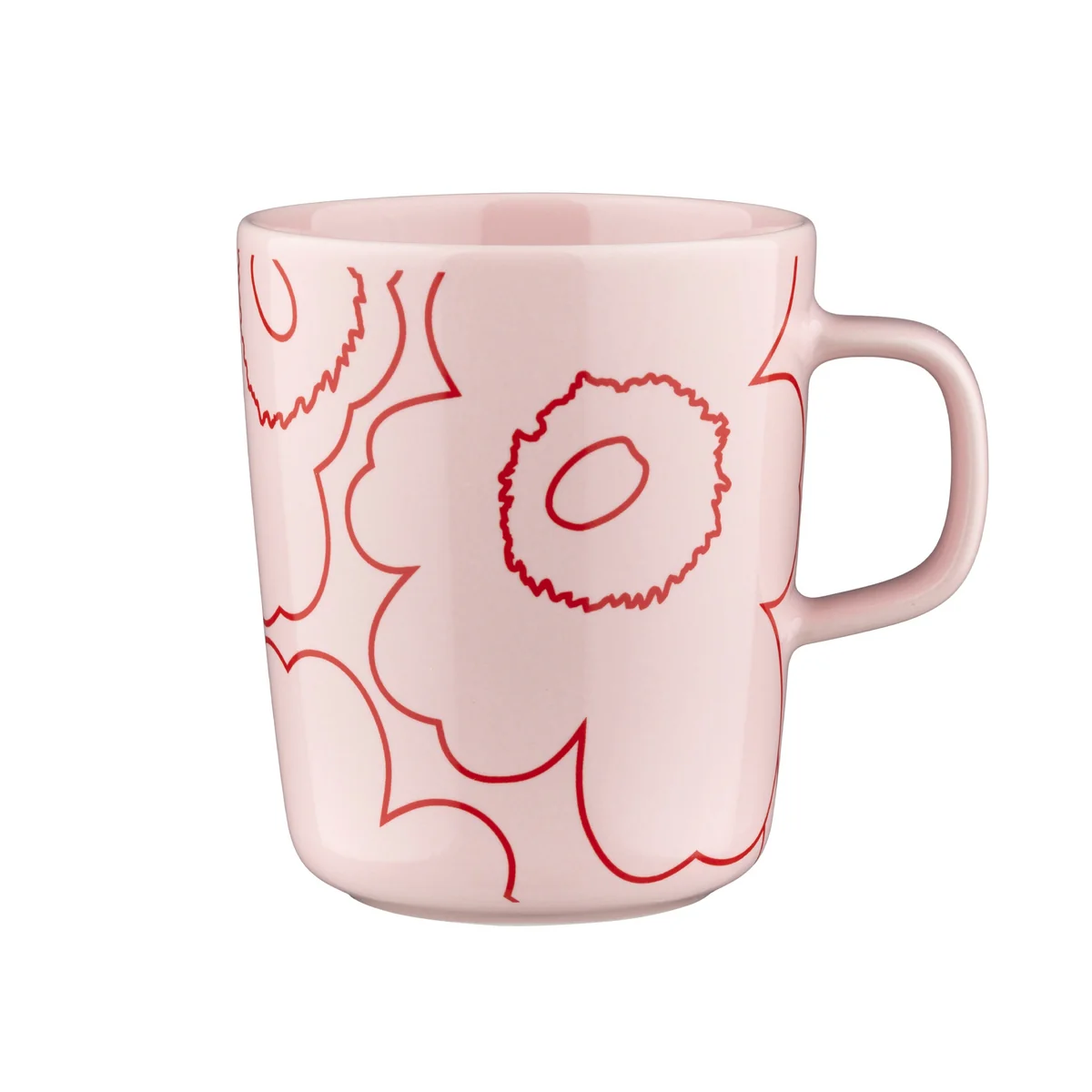 Marimekko De Oiva Piirto Unikko mok met handvat van is gemaakt van wit steengoed en kan gebruikt worden in de vaatwasser, oven, magnetron en vriezer.