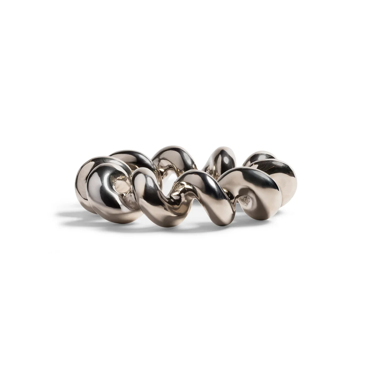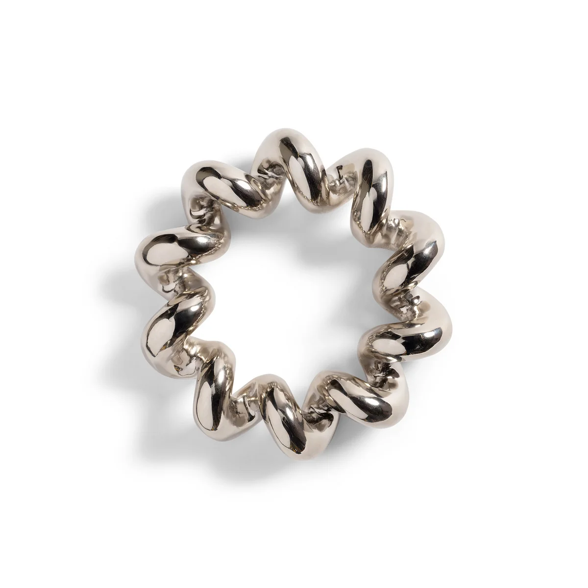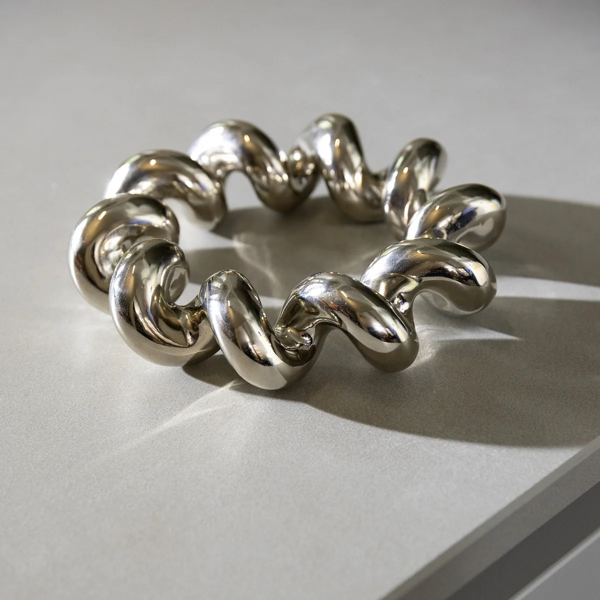 Het onderzettertje Twist combineert praktische hittebescherming met een moderne designtaal. Het gedraaide, geometrische ontwerp geeft de onderzetter een sculpturale uitstraling, terwijl de verchroomde, hittebestendige afwerking oppervlakken betrouwbaar beschermt. Hij is gegoten uit metaal en is stevig en duurzaam - een stijlvol accessoire voor de keuken en de eettafel.