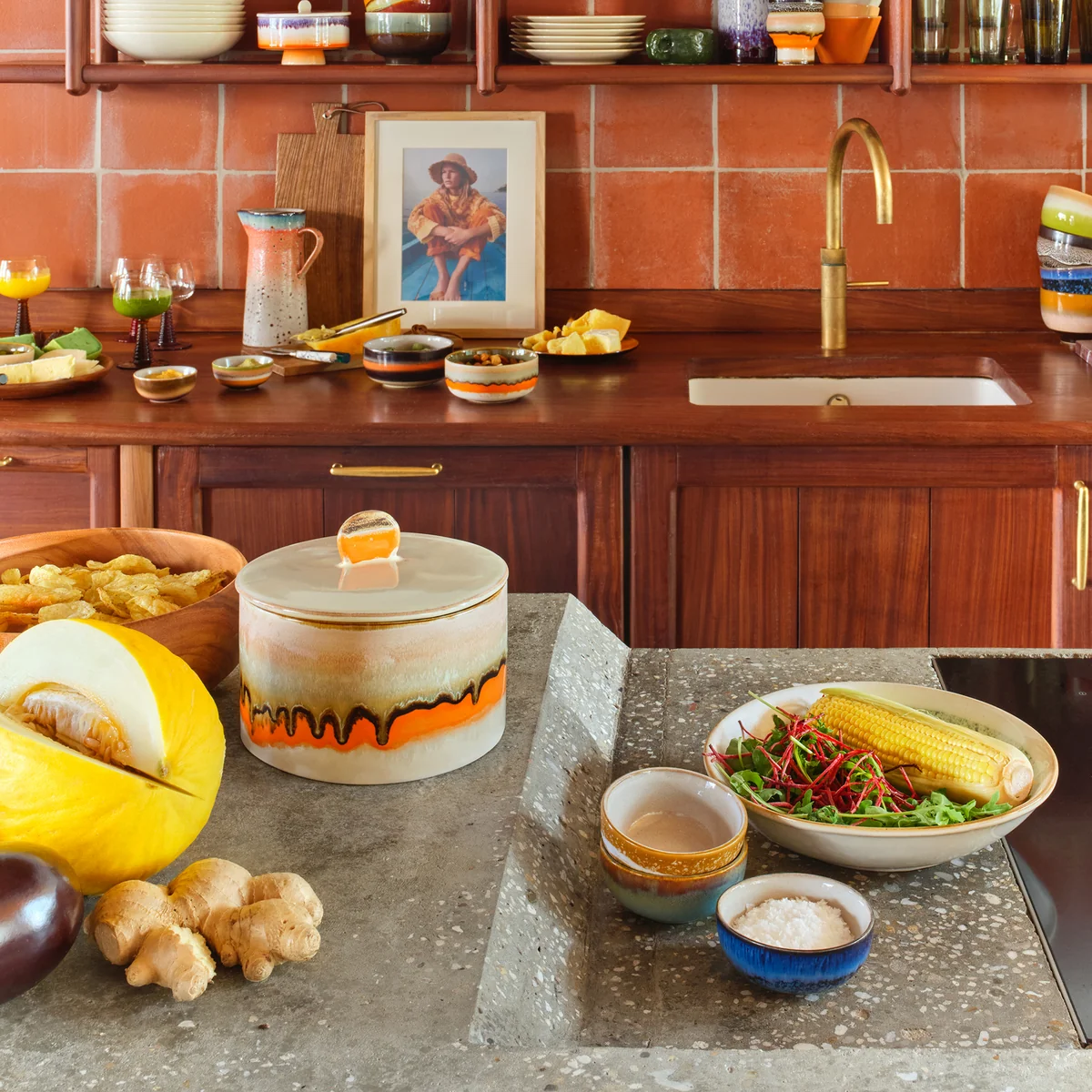 De 70's voorraadpot van HKliving is handgemaakt van keramiek en is verkrijgbaar in verschillende kleuren. Door het productieproces en de materialen is elk stuk uniek.