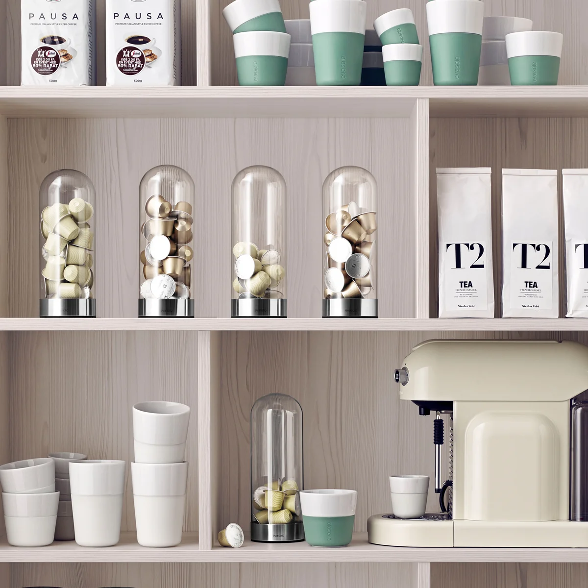 25 capsules kunnen door Eva Solo in de glasbak worden bewaard. Of u verschillende gekleurde capsules in de dispenser wilt bewaren of meerdere dispensers voor verschillende soorten capsules wilt gebruiken, is aan u.