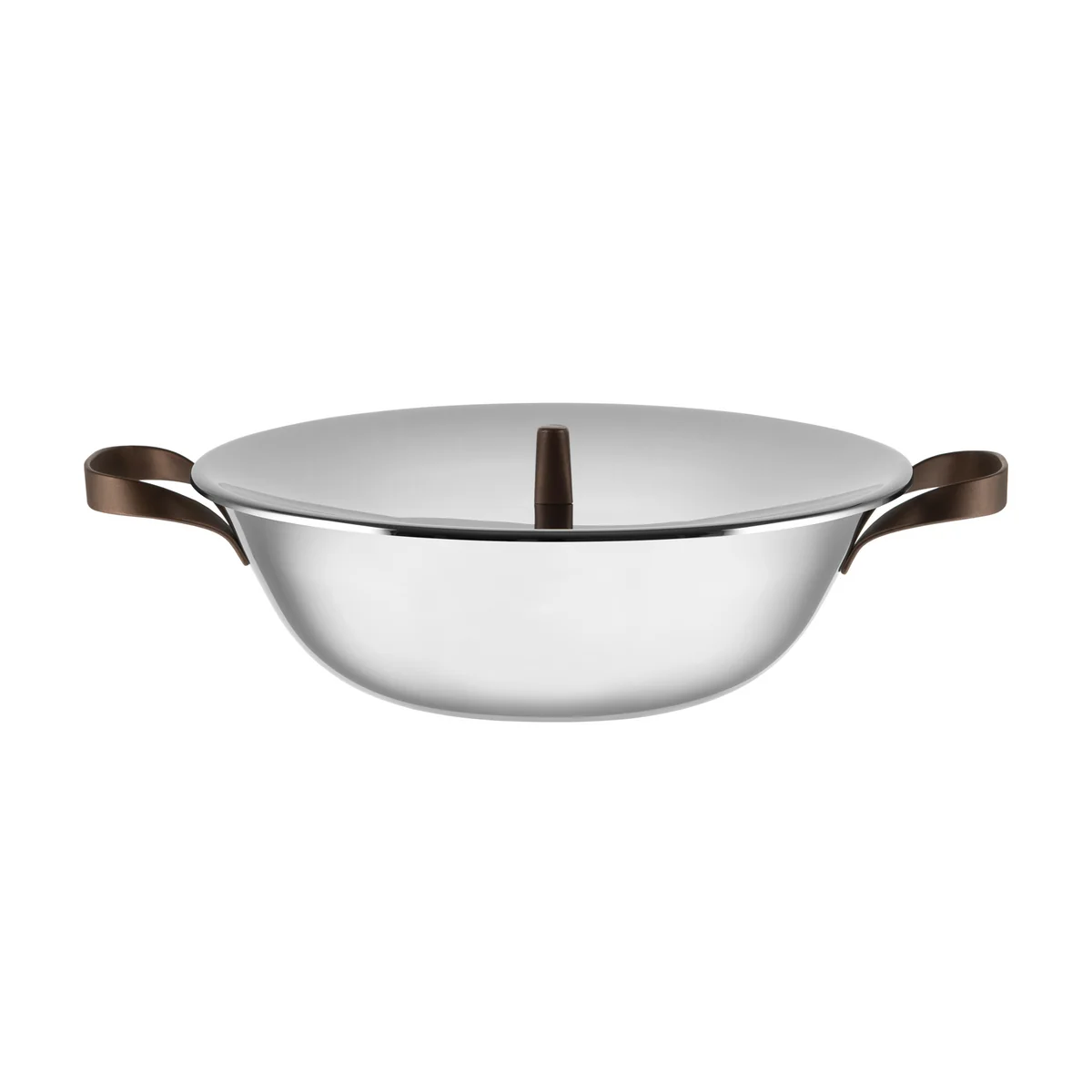 De Edo Wok van Alessi maakt deel uit van een tijdloze en elegante serie potten en pannen ontworpen door Patricia Urquiola. Met de wok en de juiste insert kunnen lichte en gezonde gerechten worden bereid met weinig vet en met behoud van alle actieve ingrediënten van het voedsel. Het sierlijke ontwerp, dat typisch is voor de potten en pannen van de Edo-serie, betekent dat de wok ook kan dienen als dienblad op de eettafel.