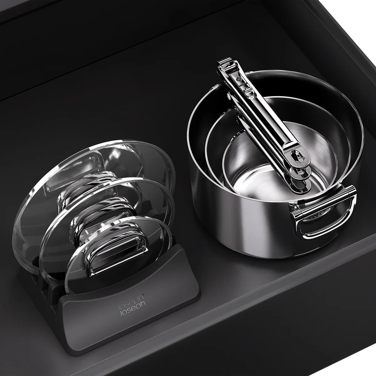 De kookpotten uit de Space serie zijn uitgerust met precies passende roestvrijstalen deksels, die ook uitklapbare handgrepen hebben en het ruimtebesparende concept voortzetten. Bovendien zorgen slimme details zoals een praktische deksellade en viltbeschermers voor een opgeruimde, krasvrije opslag, vooral bij gebruik van meerdere pannen.