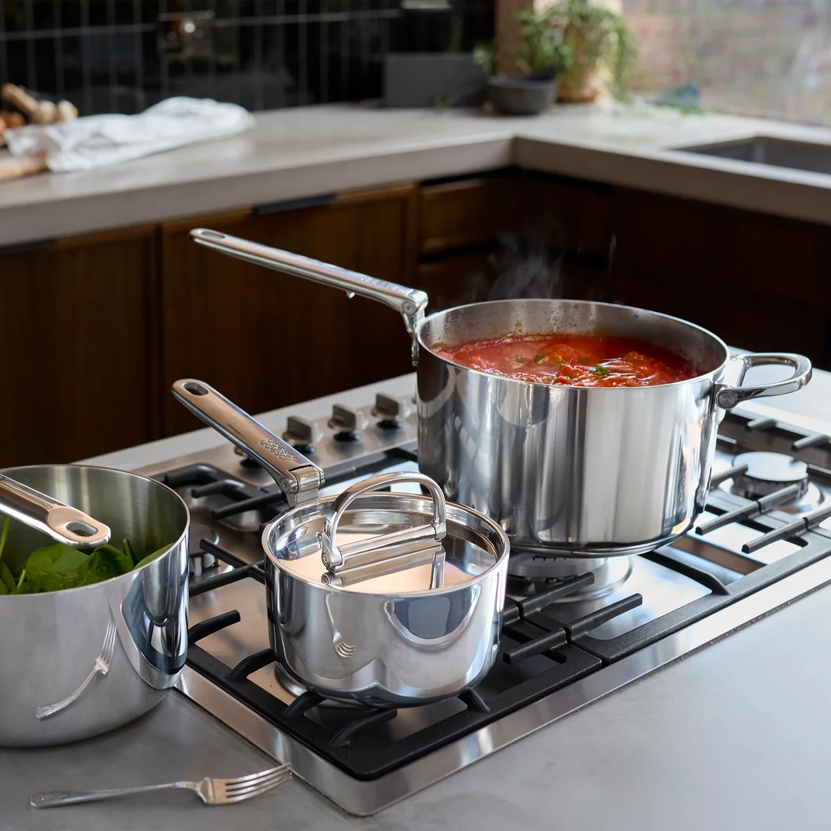 Het kookgerei overtuigt ook op het gebied van kookprestaties Space Het kookgerei maakt ook over de hele lijn indruk. Alle potten en pannen hebben een hoogwaardige 3-laags constructie waarin een gelijkmatig warmtegeleidende aluminium kern is ingebed tussen twee lagen roestvrij staal. Deze combinatie van materialen zorgt voor een snelle, gelijkmatige warmteverdeling en maakt nauwkeurig koken zonder hotspots mogelijk - van zacht sudderen tot krachtig aanbraden.