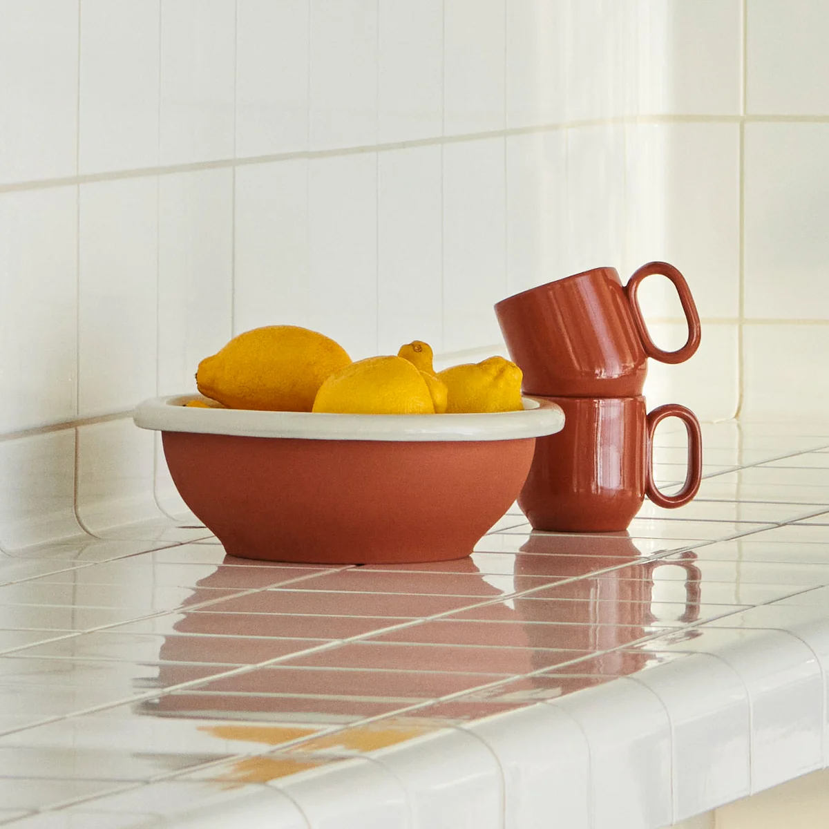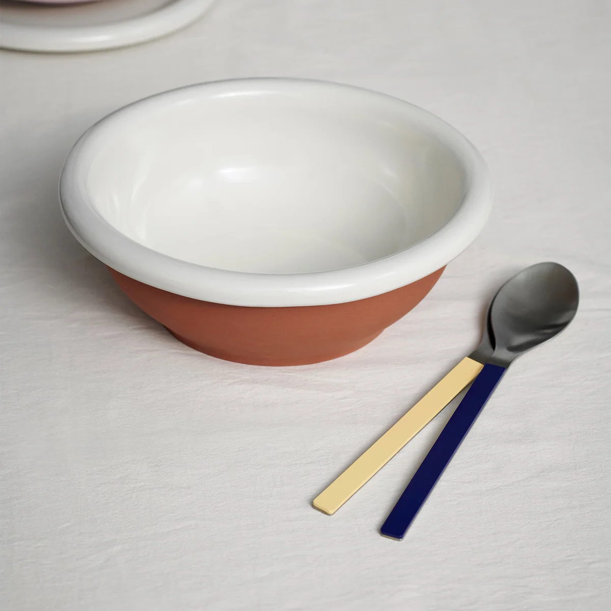De gerolde rand, het zachte gevoel en het goed geproportioneerde ontwerp van de slakom dragen bij aan zowel de visuele als de tactiele aantrekkingskracht. De kom is gemaakt in Portugal van slijtvast terracotta, is verkrijgbaar in twee maten en wordt geleverd met een keuze uit natuurlijk of hoogglanzend gekleurd glazuur en een handgeschilderd streepdetail.