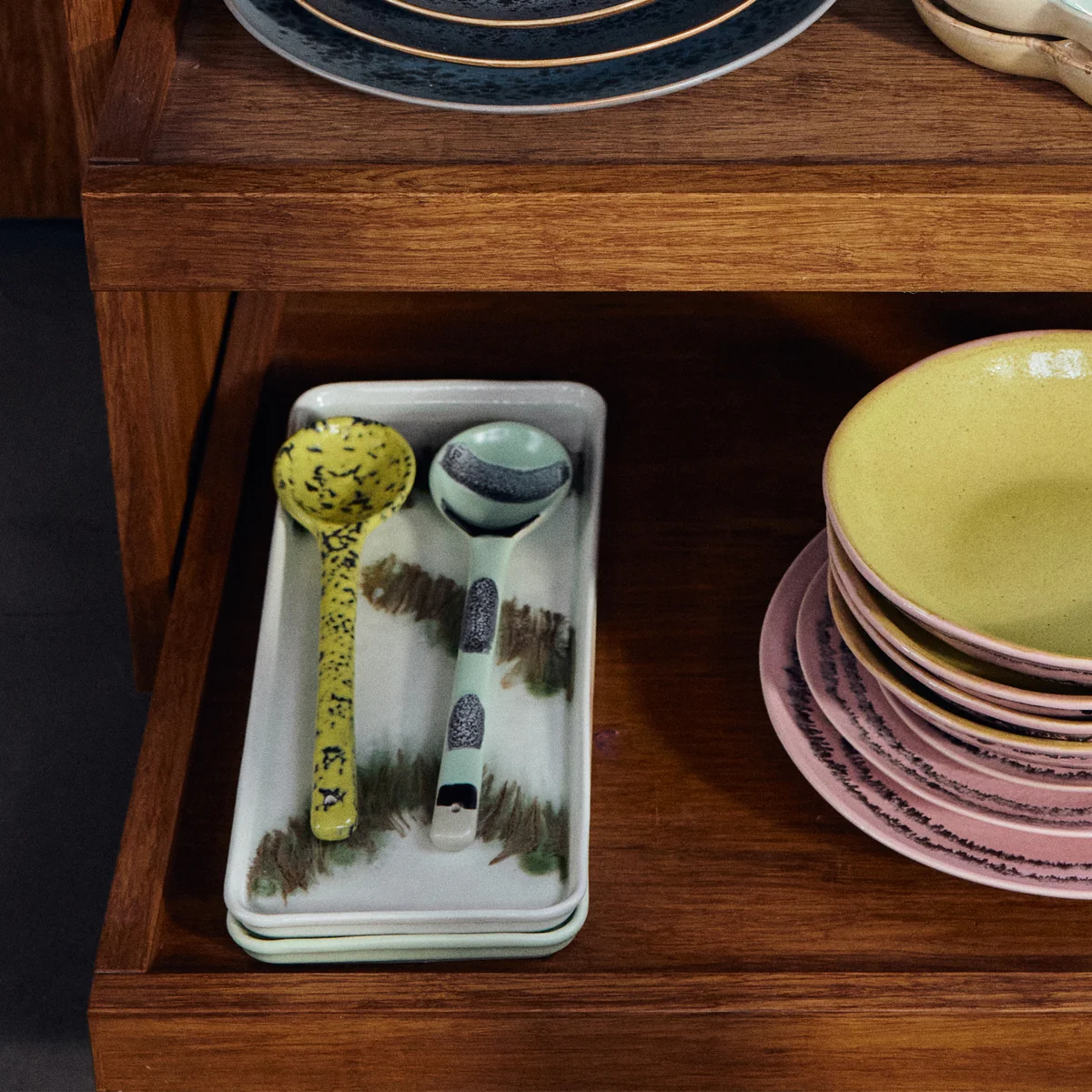 Het 70's bestek van HKliving maakt deel uit van een collectie die de creatieve geest van de jaren 70 herinterpreteert. Geïnspireerd door popart, surrealisme, expressionisme en abstracte vormen, combineert het artistieke oppervlakken met textuurglazuren en een onmiskenbare retro charme. Elk stuk ziet eruit als een samengesteld kunstobject en voegt persoonlijkheid en expressiviteit toe aan de tafelsetting. Of het nu voor diners of dagelijks gebruik is, dit bestek is functioneel, duurzaam en een echt designstatement.