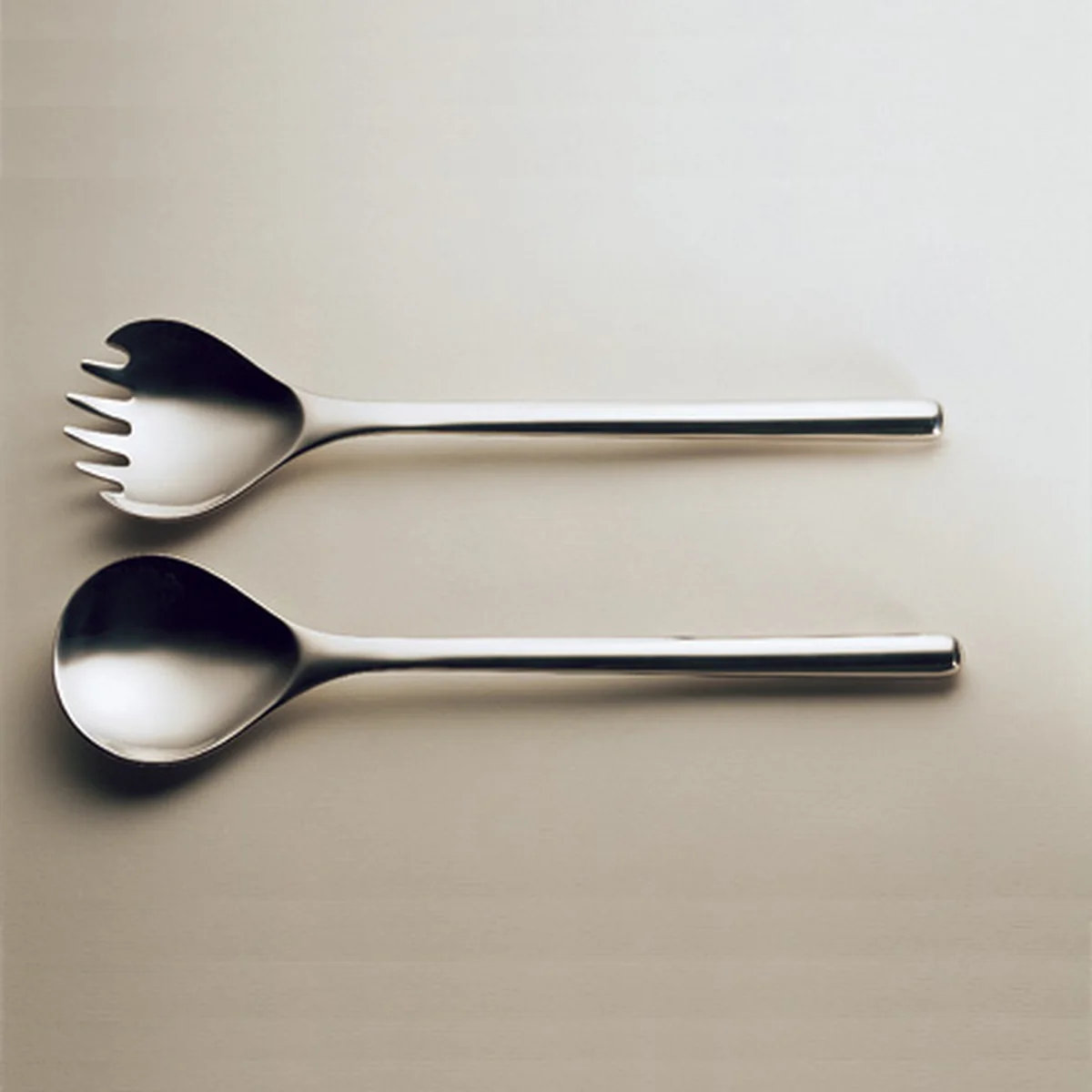De vlakheid van de vorm is in balans door de zinvolle ovale handgrepen van het bestek en de fascinerende diagonale snavels van de vork.