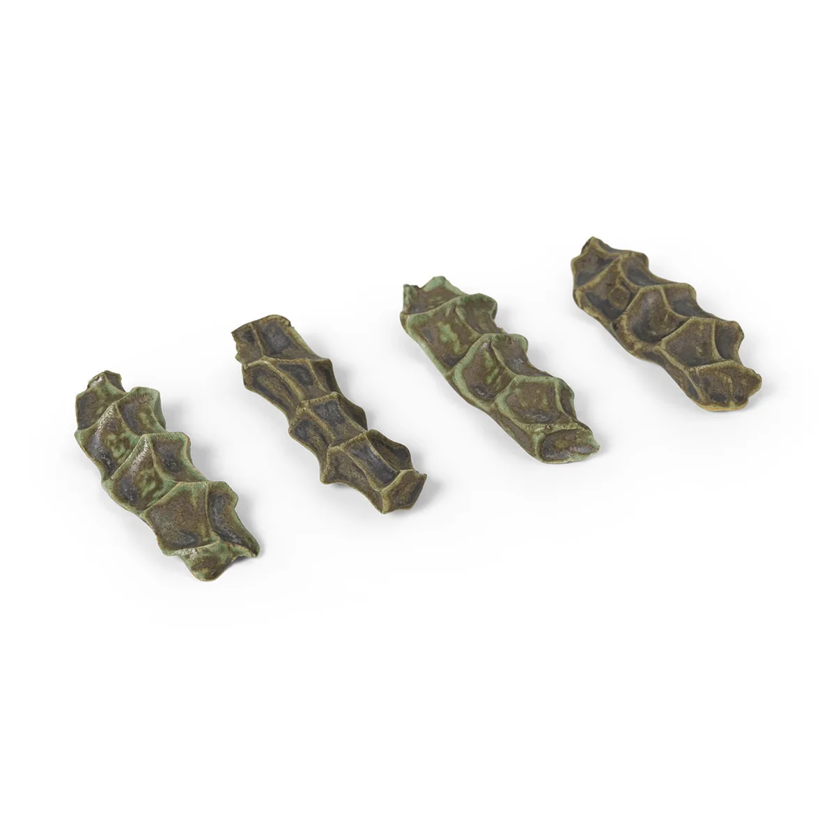 Met de Serre -besteksteunen voegt u een speciaal tintje toe aan elke gedekte tafel. De besteksteunen zijn gemaakt van klei die individueel met de hand is geperst door een ambachtsman. Elk stuk heeft unieke vingerdrukken die direct verwijzen naar de naam " Serre ", wat in het Frans "drukken" betekent. De vier besteksteunen zijn afgewerkt met een reactief glazuur dat hun handwerk benadrukt. Ze zijn verpakt in een mooie, herbruikbare houten doos met vier compartimenten, ideaal om te schenken maar ook om de stukken in op te bergen wanneer ze niet worden gebruikt.