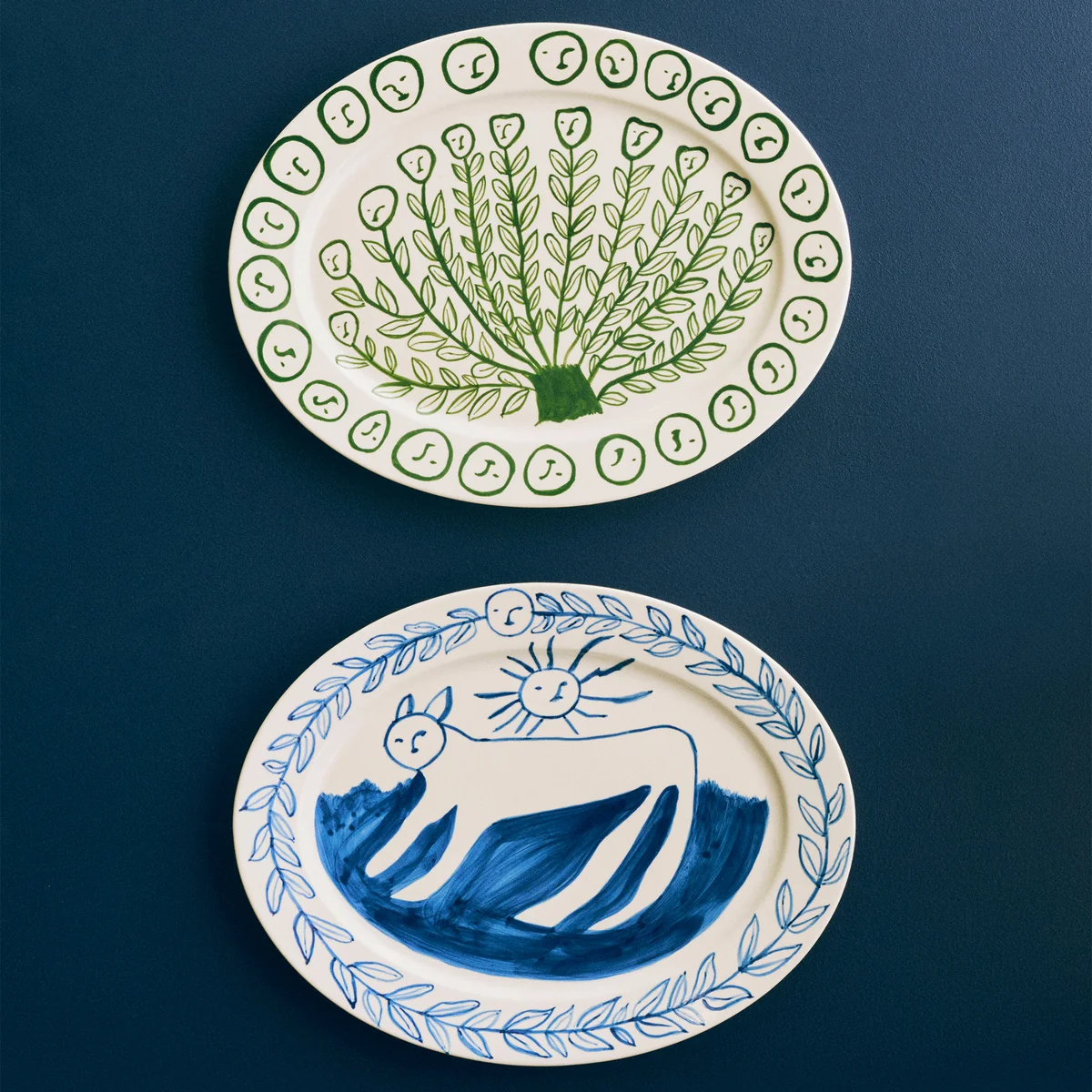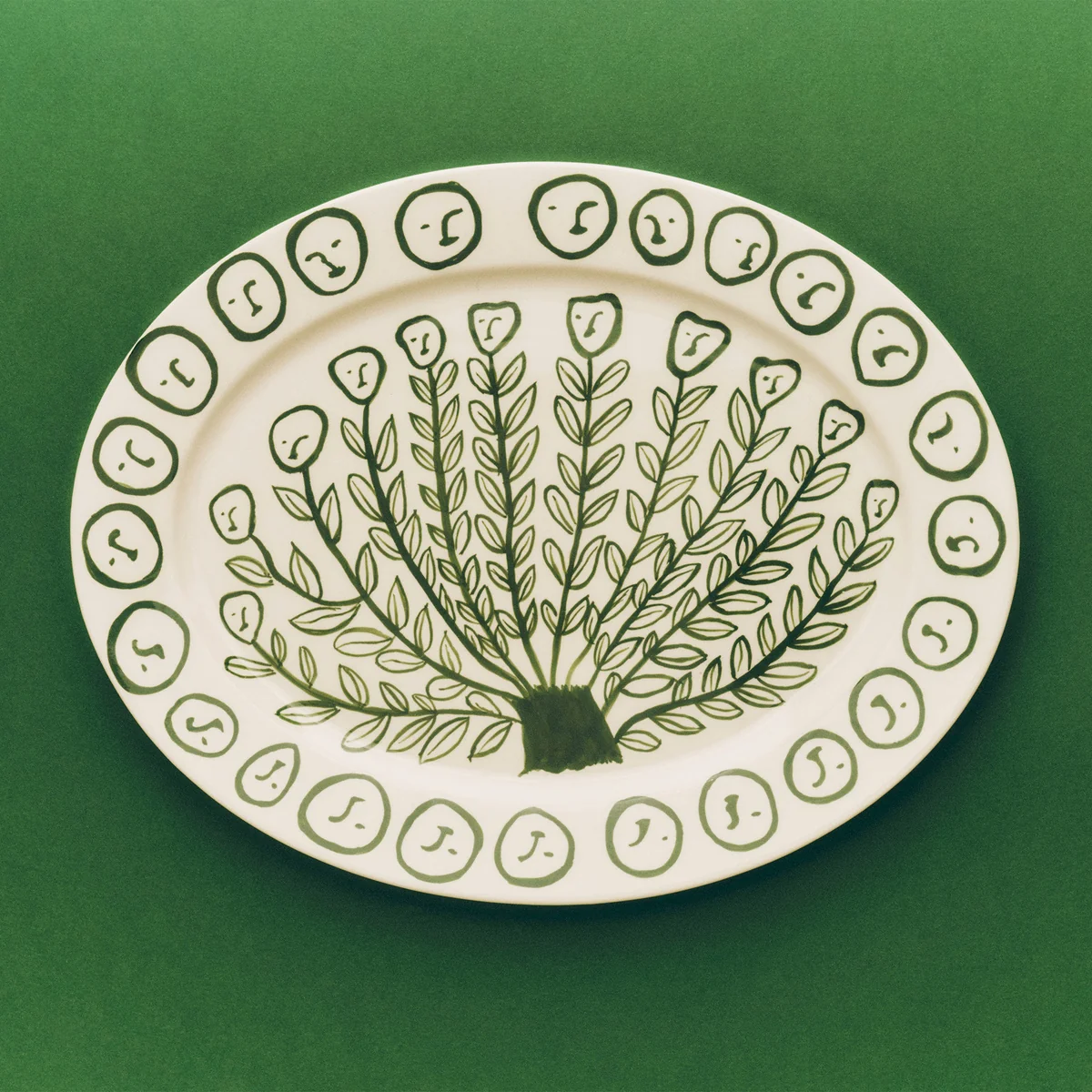 De La Pittura serveerschaal van HAY is ontwikkeld in samenwerking met de Amerikaanse kunstenares Emma Kohlmann. Deze collectie handbeschilderde keramische schalen brengt Kohlmanns speelse en expressieve ontwerpen direct in huis. De serie is geïnspireerd op historisch keramiek, combineert kunst met praktisch nut en maakt van elke maaltijd een visuele ervaring. De dienbladen zijn verkrijgbaar in levendige kleuren en zijn versierd met Kohlmanns kenmerkende motieven, waardoor de collectie een unieke, artistieke touch krijgt.