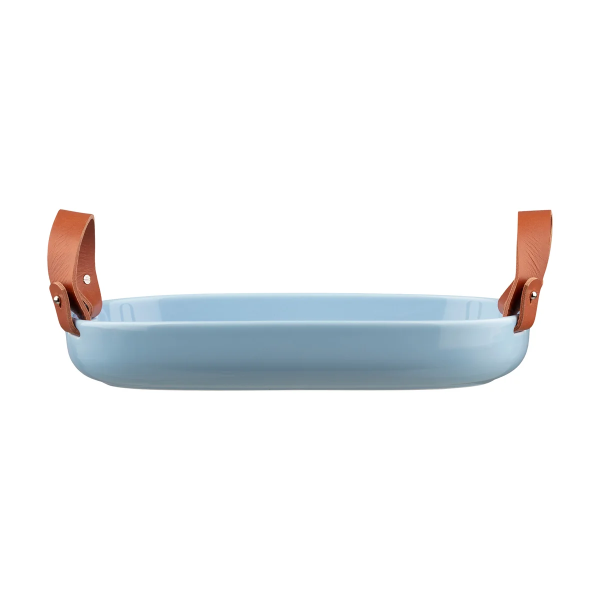 De Iso Koppa serveerschaal is gemaakt van keramiek met een lichtblauw glazuur en heeft afneembare leren handgrepen, die verwijderd moeten worden voor het afwassen. Ideaal voor stijlvol serveren, combineert functionaliteit met elegant design.