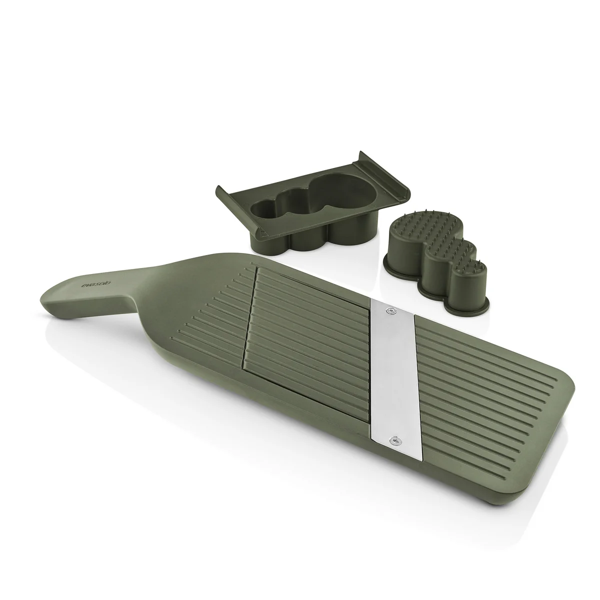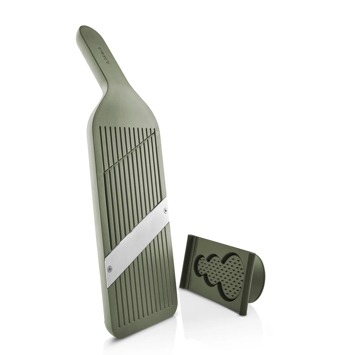 Met de Green Tool groentensnijder van Eva Solo kunnen groenten en fruit snel en gemakkelijk in dunne, gelijkmatige plakjes worden gesneden. Van de kleinste nootmuskaat tot grote portobello champignons - de groentensnijder maakt het vervelende hakwerk gemakkelijker. Het heeft een dubbele houder met drie compartimenten. De verschillende compartimenten zorgen er moeiteloos voor dat het voedsel tot de kleinste stronk wordt verwerkt, zodat er zo weinig mogelijk afval ontstaat. Met de schroef aan de achterkant van de groentesnijder kan de snijdikte worden ingesteld. De rubberen voetjes stabiliseren de groentesnijder en de robuuste, ergonomische handgreep biedt een stevige grip. Het ontwerp maakt een perfecte werkhoek mogelijk om direct in een kom of op een snijplank te snijden. De Green Tool is vaatwasmachinebestendig.
