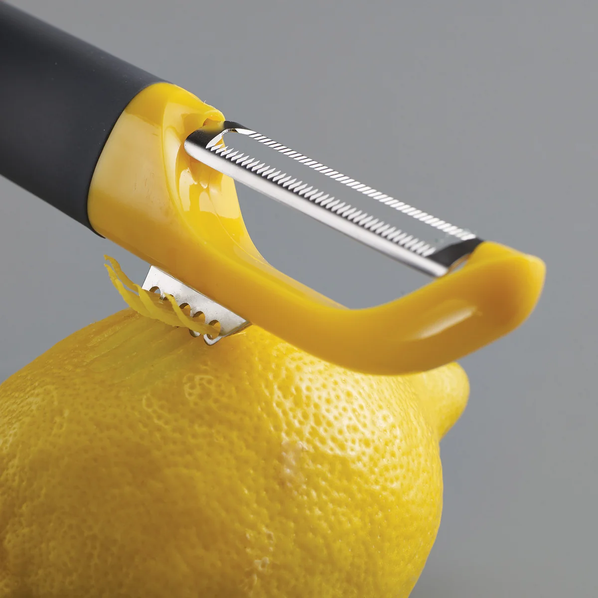 Het mes van deze schiller is de perfecte hulp bij het schillen van fruit. Het gekartelde blad schillen citroenen gemakkelijk, om taarten in een oogwenk fruitig te maken. De geïntegreerde schilmes snijdt fijne strepen van de schil van citrusvruchten, verfijnt de maaltijden en versiert de borden.