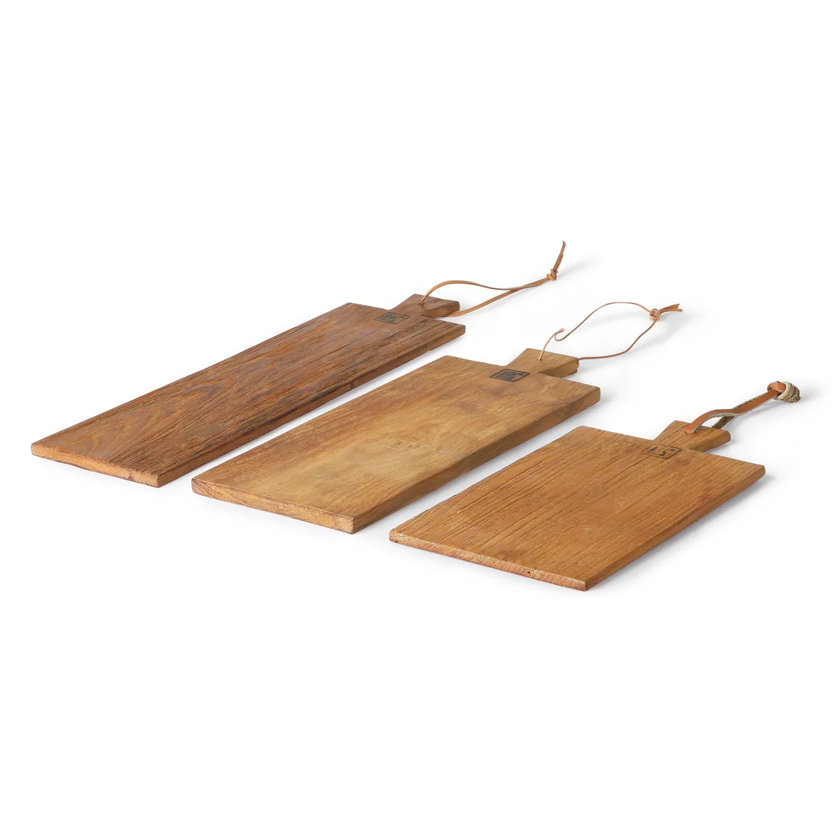 De set is gemaakt van teakhout en bestaat uit drie serveerplanken van verschillende afmetingen met een praktische leren riem om ze op te hangen.