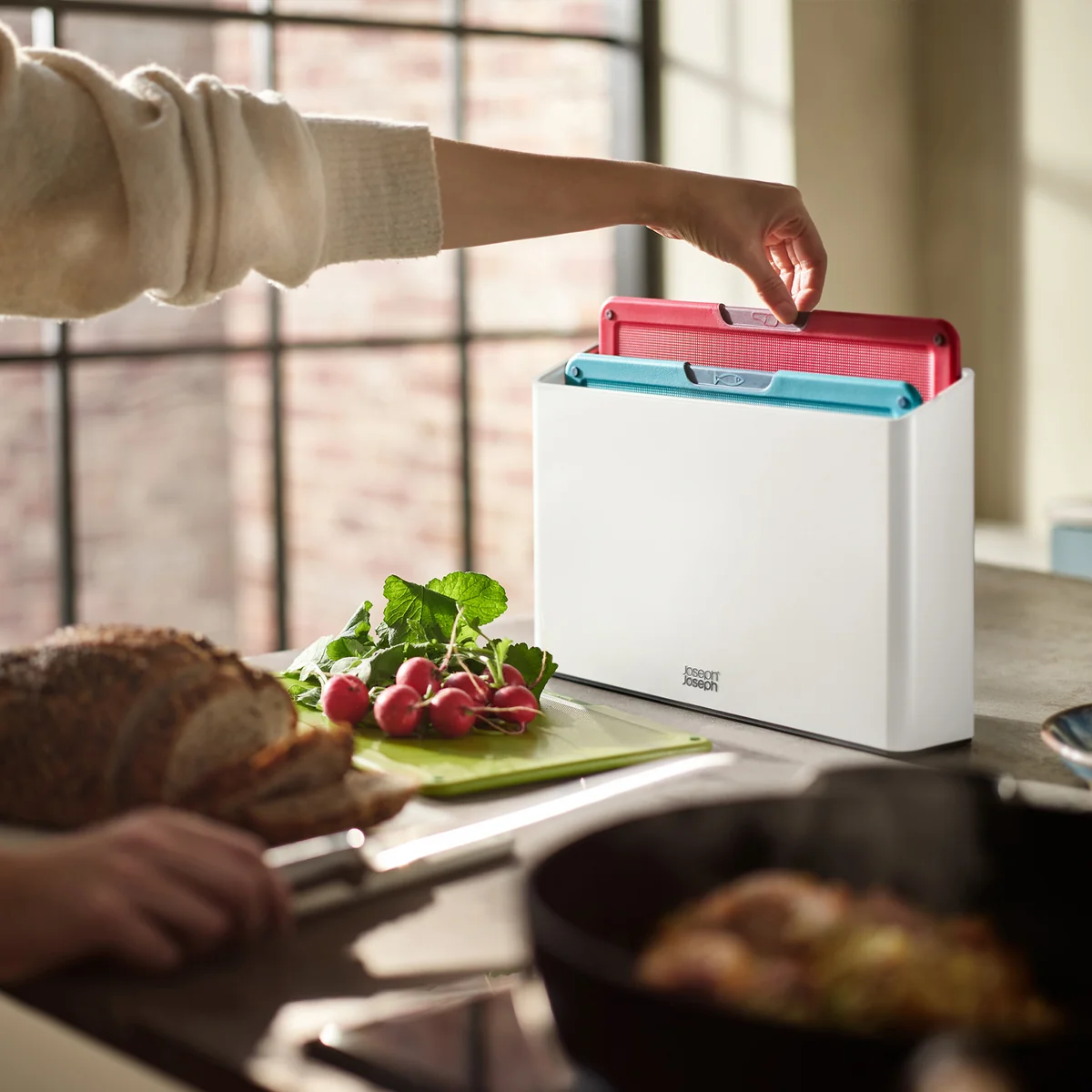 De Folio Icon Snijplanken van Joseph Joseph zijn het antwoord op de uitdaging van kruisbesmetting in je keuken. Deze set van 4 voedselveilige, antislip snijplanken wordt geleverd met een slank opbergbakje om alles netjes en hygiënisch te houden. De kleurcodering en symbolen op de planken zijn erg handig om ervoor te zorgen dat verschillende soorten voedsel apart worden verwerkt. Of het nu gaat om rauw vlees, rauwe vis, groenten of gekookt voedsel, de kleurgecodeerde planken laten duidelijk zien waarvoor ze gebruikt moeten worden. De snijvlakken zijn niet alleen gemakkelijk schoon te maken, maar ook mesvriendelijk om je messen te beschermen. In de bijgeleverde container kun je de planken apart opbergen en is er een goede luchtcirculatie. Met de Folio Icon snijplanken wordt koken in je keuken veiliger, hygiënischer en efficiënter.