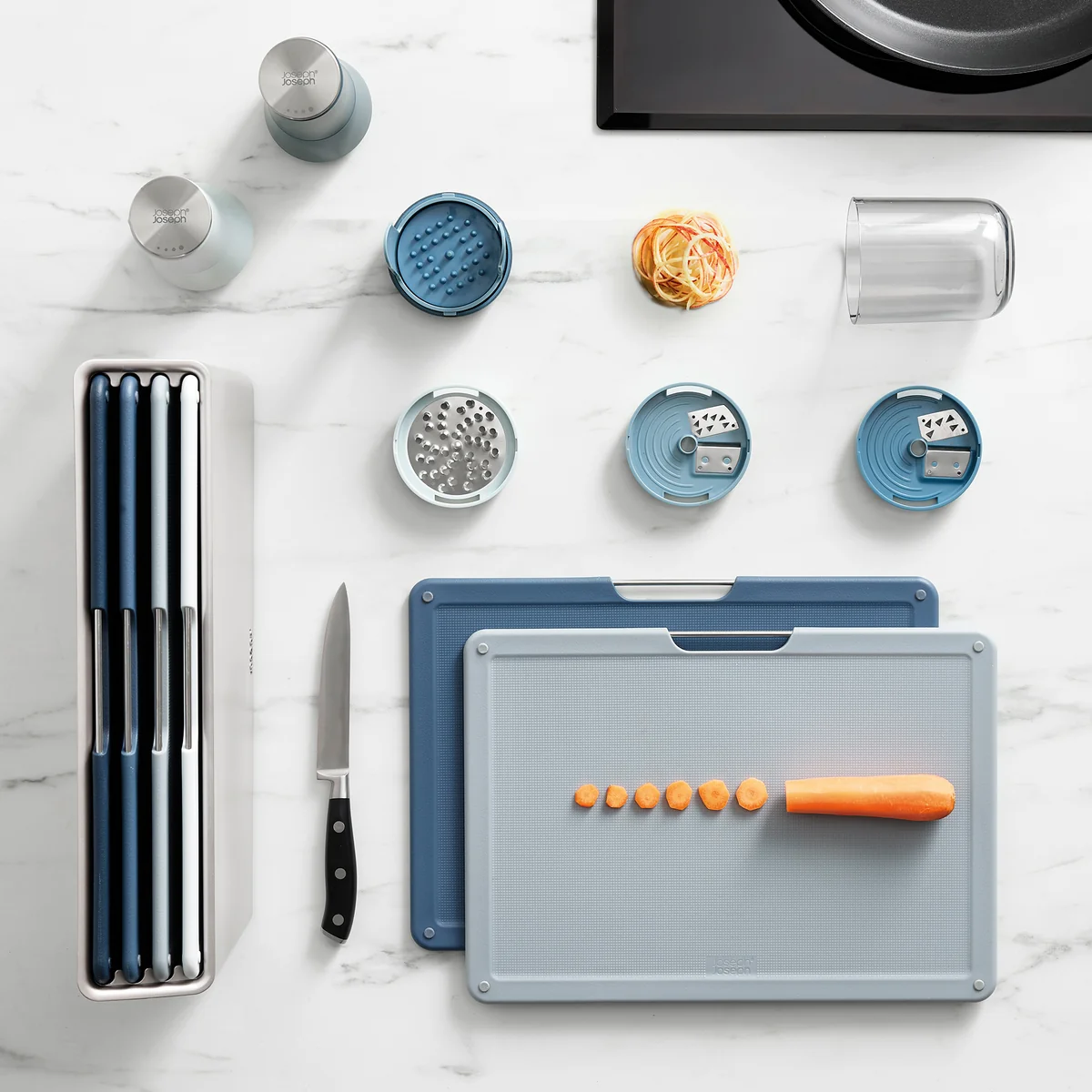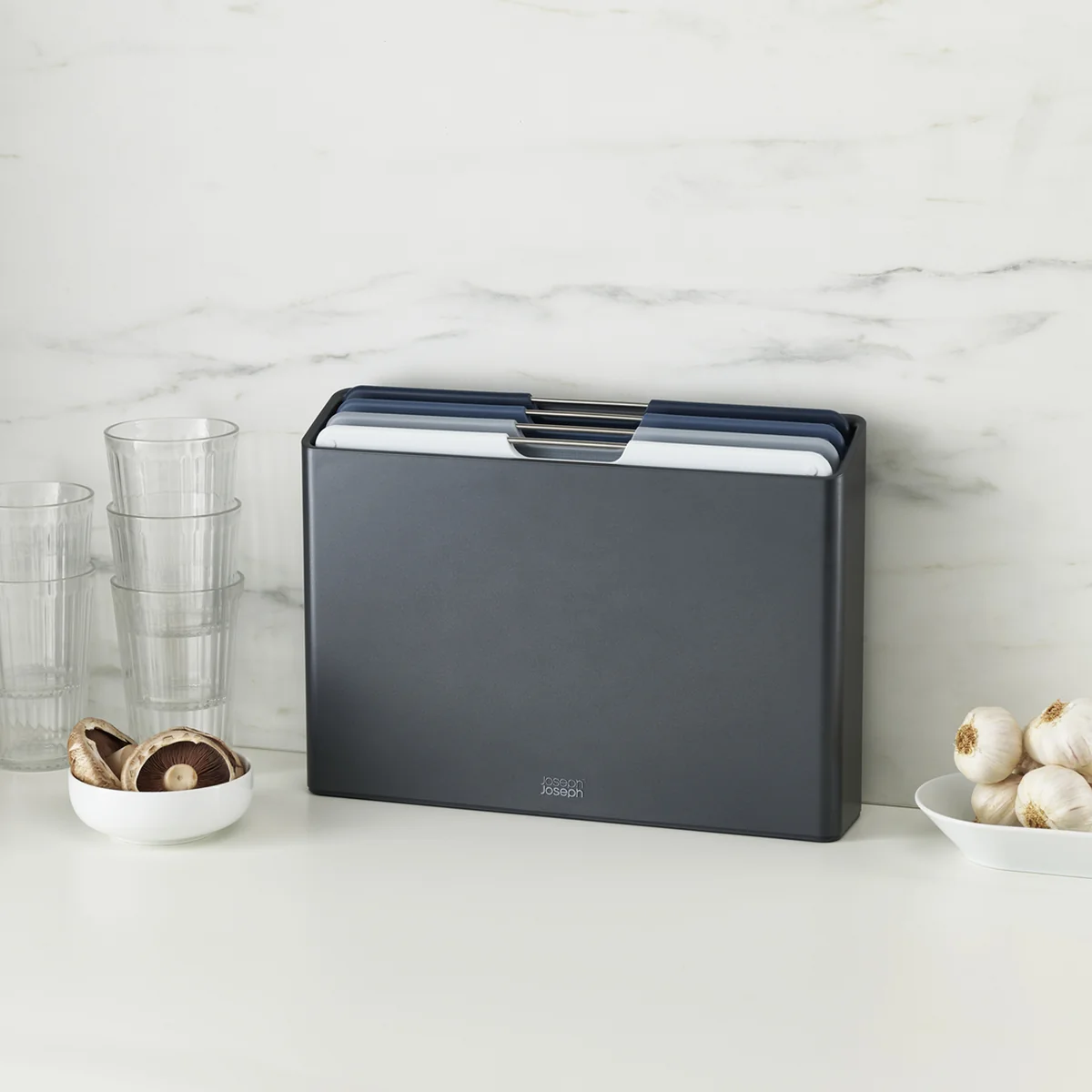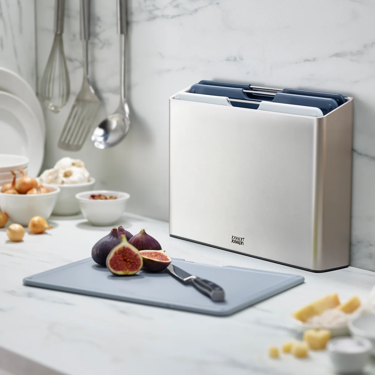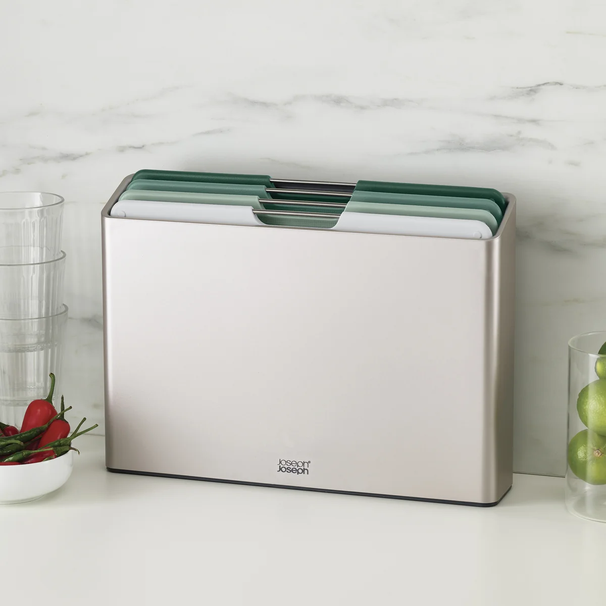 De Folio Stalen snijplanken van Joseph Joseph helpen orde te bewaren in de keuken. Vier verschillende kleuren snijplanken zijn opgeborgen in een slanke roestvrijstalen behuizing en kunnen gemakkelijk worden verwijderd door een handvat.