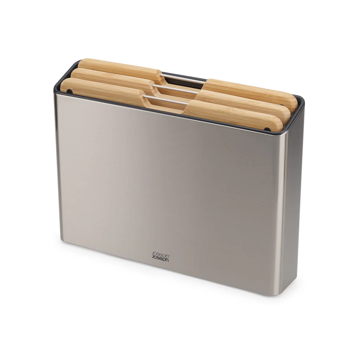 De Folio Stalen snijplanken van Joseph Joseph helpen orde te bewaren in de keuken. Vier verschillende kleuren snijplanken zijn opgeborgen in een slanke roestvrijstalen behuizing en kunnen gemakkelijk worden verwijderd door een handvat.