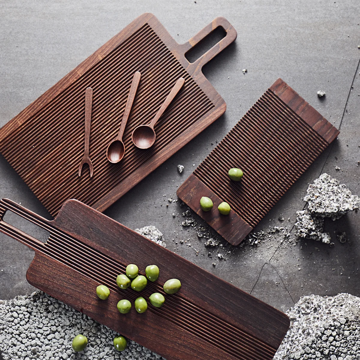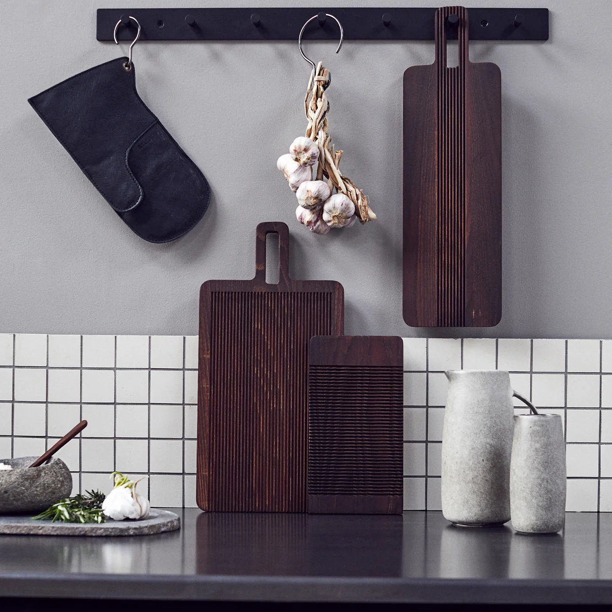 De Yami dienbladen van de fabrikant Muubs zijn geïnspireerd door de Japanse designfilosofie. De esthetische borden zijn ideaal voor het serveren van kaas, tapas, brood, fruit en groenten en nog veel meer. Ze kunnen echter ook worden gebruikt voor het snijden van allerlei soorten voedsel. De Yami planken zijn gemaakt van verkoolde as. Afhankelijk van het ontwerp is het mogelijk de afzonderlijke planken op te hangen.