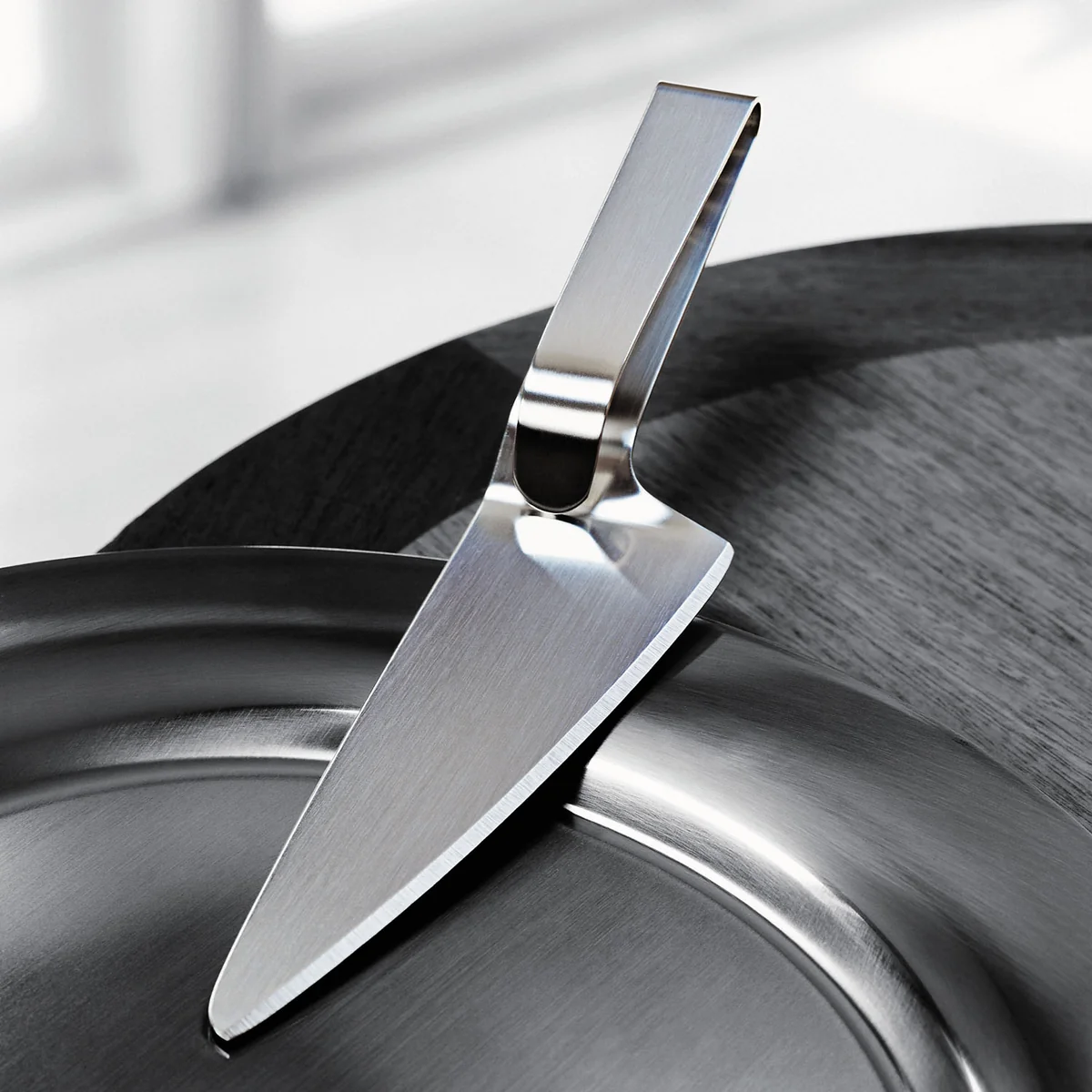 Erik Magnussen ontwierp het taartmes/krukje voor Stelton . Met het praktische bestek kunnen stukken taart en cake in één stap worden gesneden en geserveerd.