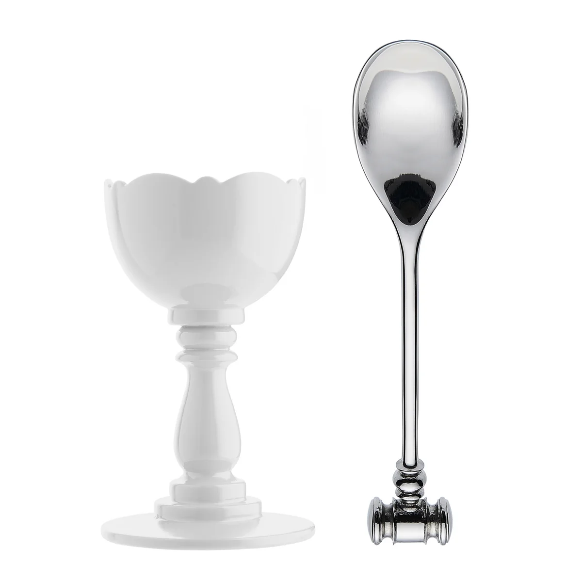 Naast de ongebruikelijke vorm van het eierdopje is ook de bijgevoegde lepel een reden waarom dit een "must have" op de ontbijttafel is. De roestvrijstalen lepel wordt geleverd met een praktische hamer aan het einde, waarmee het ei gemakkelijk te breken is door erop te tikken.