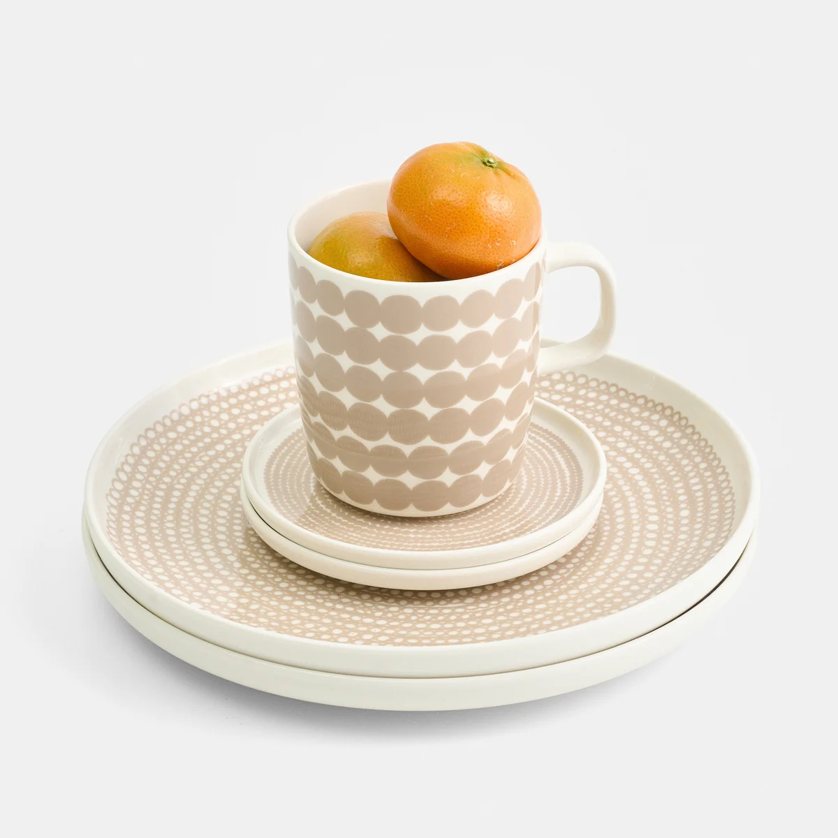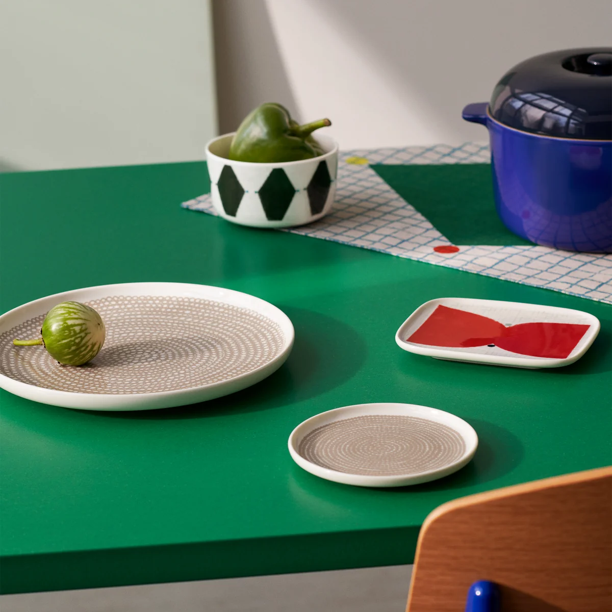 Net zo kleurrijk is de oorsprong van de Marimekko Oiva Siirtolapuutarha bord: het iconische Siirtolapuutarha patroon werd gecreëerd door Maija Louekari, terwijl Sami Ruotsalainen de vorm van het bord ontwierp. Oiva Sami Ruotsalainen ontwierp de vorm van het bord.