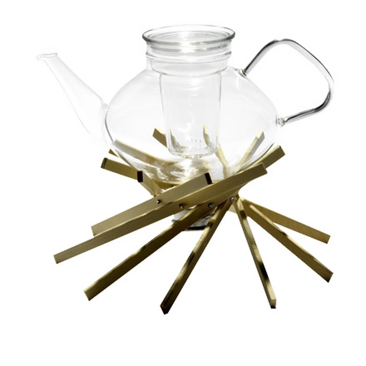 De theepotwarmer "keep'ot!" doet ons denken aan een gezellig kampvuur waarop de thee warm wordt gehouden. Christoph Matthias, een industrieel ontwerper uit München, ontwierp dit product. De stukken hout van de "keep`ot`ot!" theepotwarmer zijn gemaakt van geolied notenhout en zijn met elkaar verbonden door roestvrijstalen bevestigingen die een theelichtje en de fles vasthouden. De "keep'ot!" warmer wordt eenvoudigweg opgezet door hem te draaien.