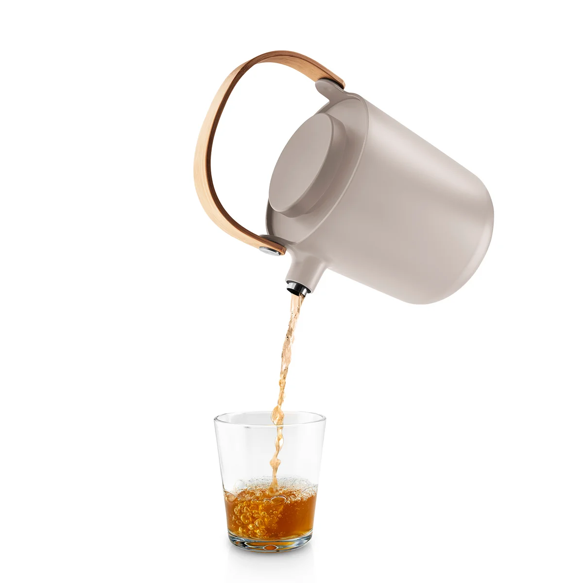 De Nordic Kitchen De thee-thermosfles van Eva Solo is onmisbaar dankzij haar elegante look en hoge functionaliteit. De duidelijke lijnen en de uiterst esthetische combinatie van kunststof, roestvrij staal en bamboe passen perfect in een moderne omgeving. De thermoskan kan uitstekend worden gebruikt voor het zetten en serveren van thee. Het uitneembare filter kan er gemakkelijk worden uitgehaald zodra de theeblaadjes zijn doorgetrokken. Het bamboe handvat kan rechtop of neergeklapt worden geplaatst, zodat het zo weinig mogelijk plaats inneemt in de koelkast. De Nordic Kitchen De thermoskan is volledig druppelvrij en de stalen thermosinzet houdt uw favoriete thee urenlang warm.