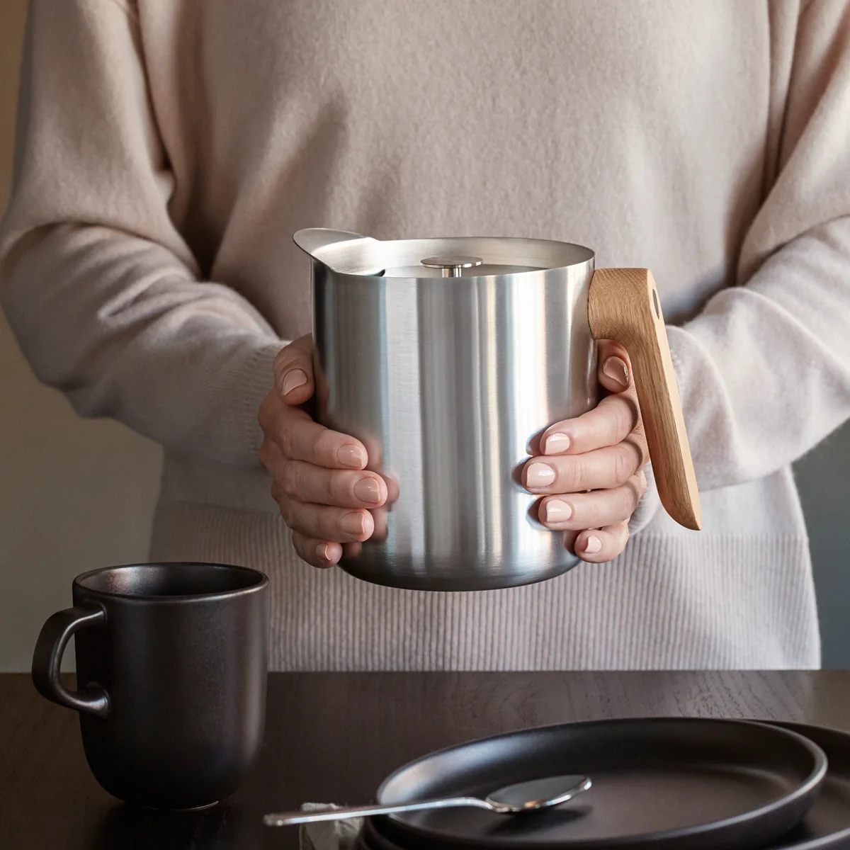 Het hoogwaardige Scandinavische design van roestvrij staal en eikenhout maakt de kan tot een decoratief item op elke eettafel of aanrecht.