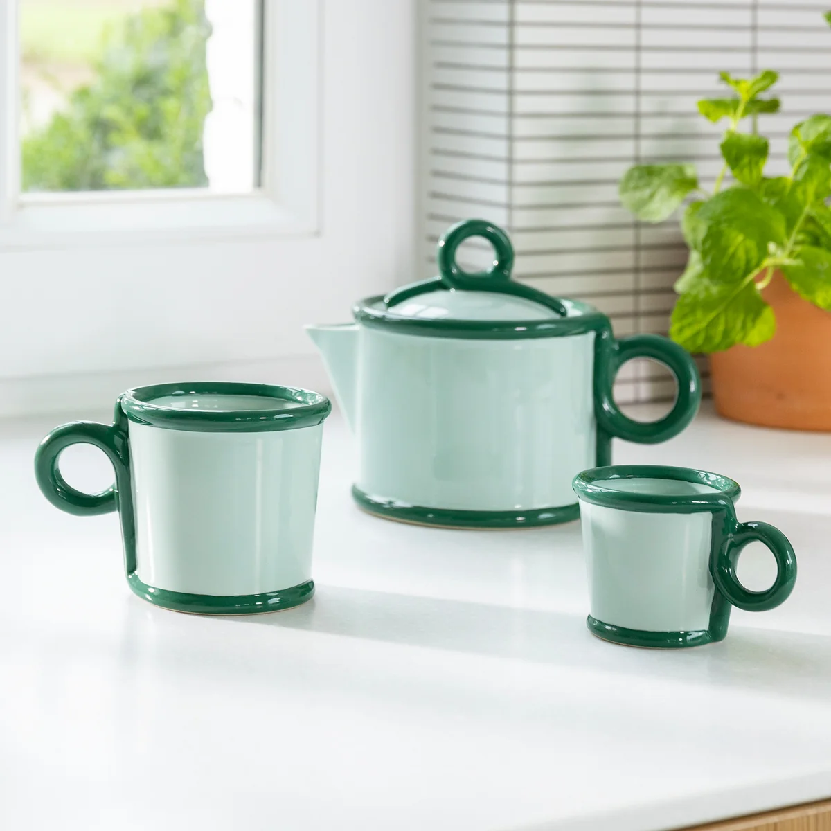 De Loop theepot combineert artistiek design met praktische functionaliteit. Het vloeiende handvat, geïnspireerd op een lus, geeft de theepot een dynamisch, sculpturaal karakter. De handgeschilderde rand benadrukt het ontwerp, terwijl de ton sur ton kleur diepte toevoegt.