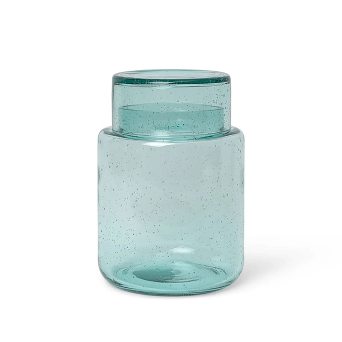 De Oli glazen pot van Ferm Living is gemaakt van 100% gerecycled glas. Opvallend zijn de vele kleine belletjes in het glas, die ontstaan door opzettelijke luchtbellen tussen de lagen van het mondgeblazen glas.