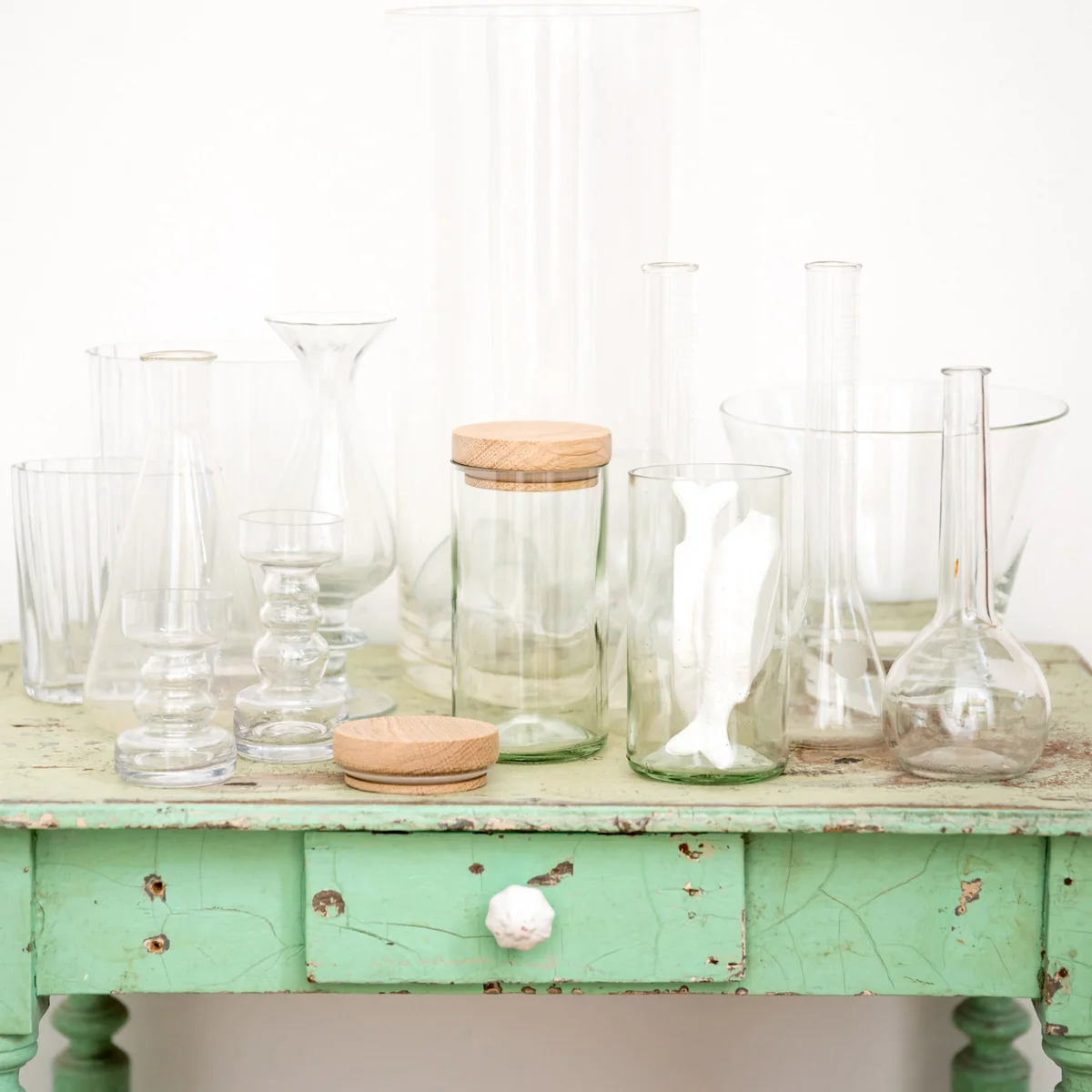 Het door Jette Scheib ontworpen opbergglas is verkrijgbaar in helder en groen getint glas. Het werd vervaardigd in de Caritas Wendelstein-werkplaats in Raubling.