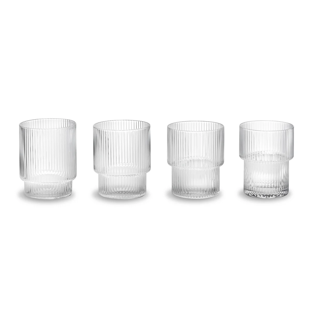 Deze set van vier mondgeblazen glazen uit de Ripple serviesserie van Ferm Living wordt gekenmerkt door een prachtig geribbeld oppervlak en een individuele uitstraling, want - elk van de glazen in de set heeft een andere vorm.
